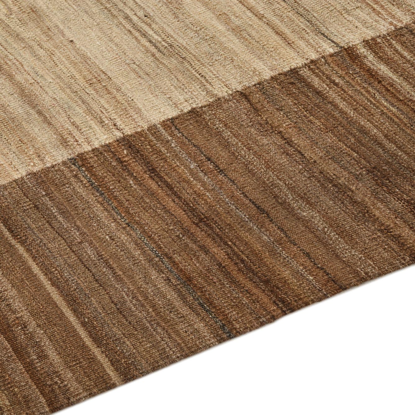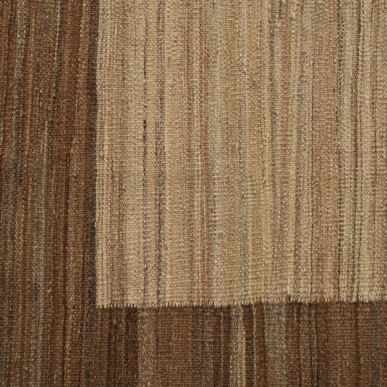 The Kilim Modern 6x9 rug is a hand-woven piece that exemplifies the simplicity and elegance of contemporary design. Made of 100% wool, this rug offers a tactile experience that is both warm and inviting. The pattern displays an understated geometric design, featuring a broad beige central panel flanked by darker, rich brown stripes.