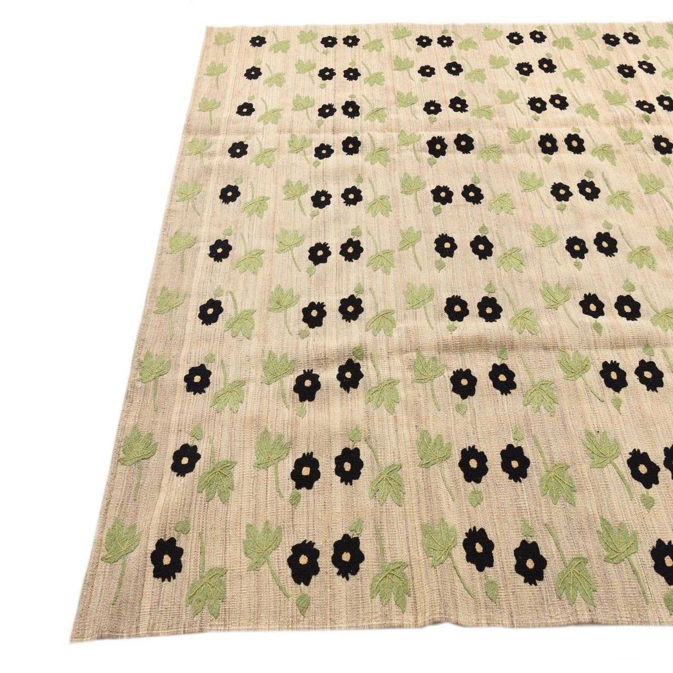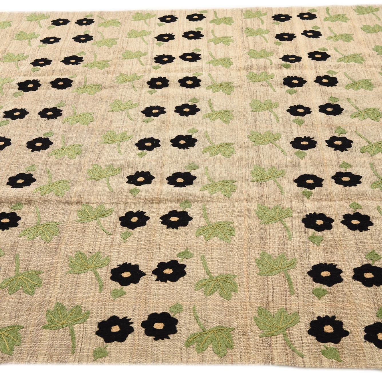 A warm beige ground sets a calm, textural backdrop for a tight, hand?woven 100% wool flatweave patterned with a regular grid of small black flowers, each punctuated by a peach center, and paired with alternating green and light?green leaves. The repeated floral motif gives the rug a tidy, vintage?inspired rhythm without feeling busy; the low?profile wool weave has a slightly firm hand with subtle surface variation from the weaving that adds depth when you run your fingers across it.