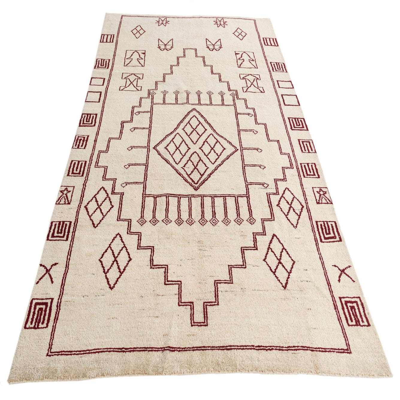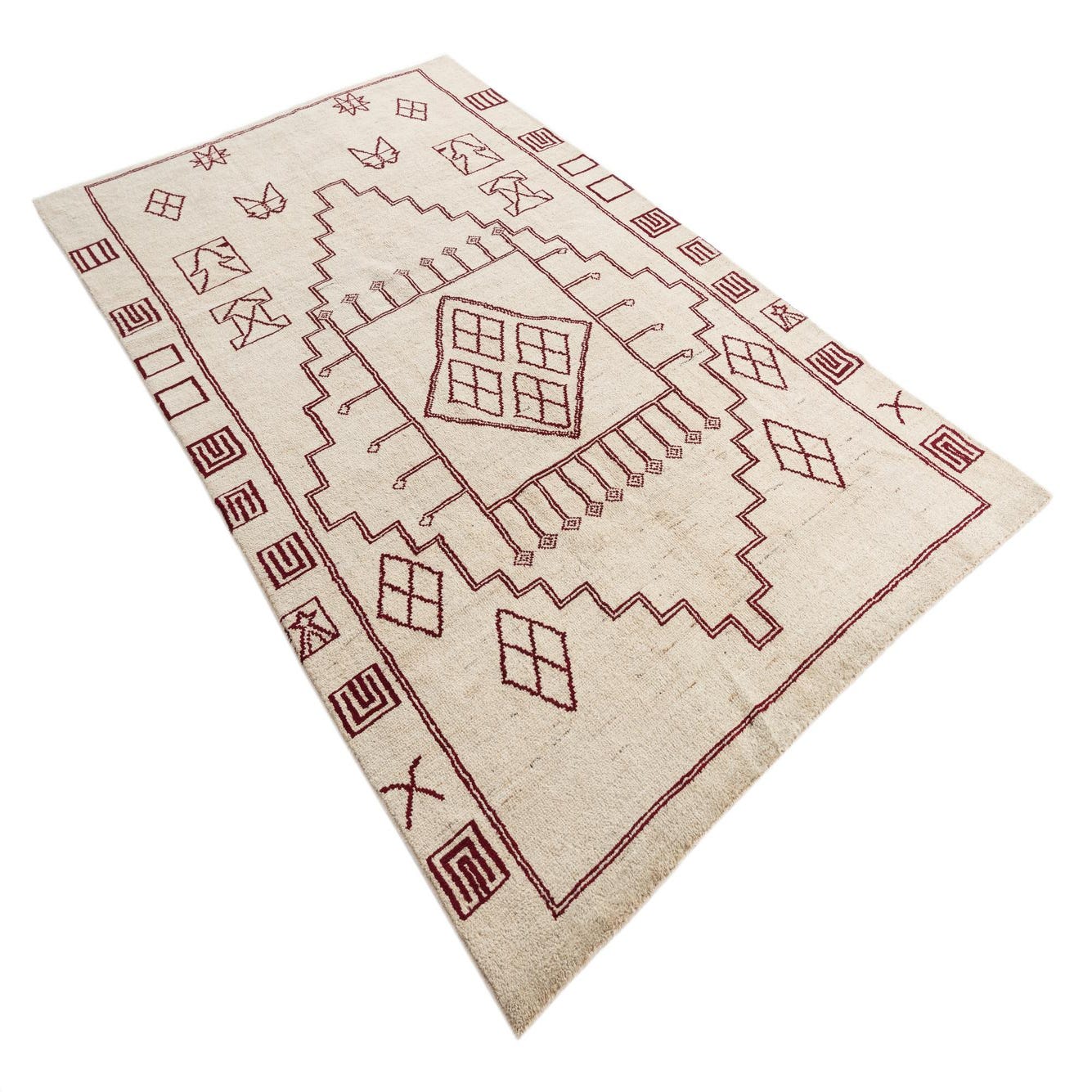 A 6x9 rectangular Moroccan shag rug with a cream background and rich brown tribal patterns, perfect for a living room.
