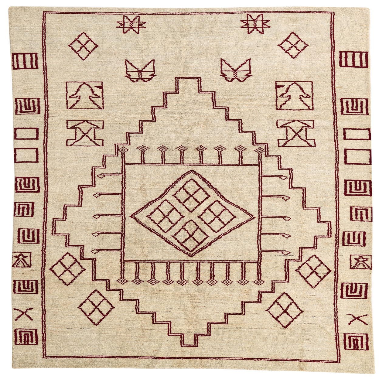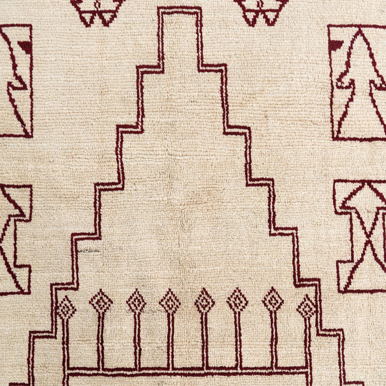Primary color is Beige. Colors in this rug include: Beige, Burgundy.