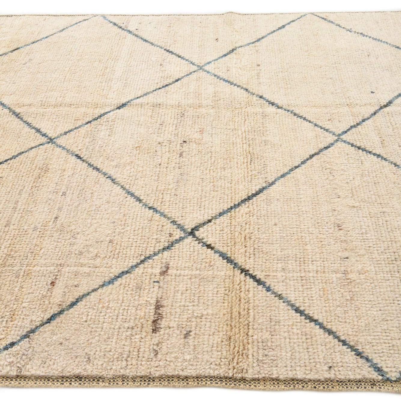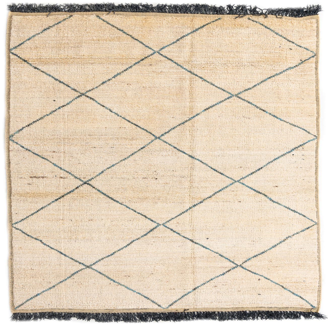 A 6x9 rectangular Moroccan shag rug with a cream and tan base, featuring a tribal diamond pattern in blue, with dark fringed ends.