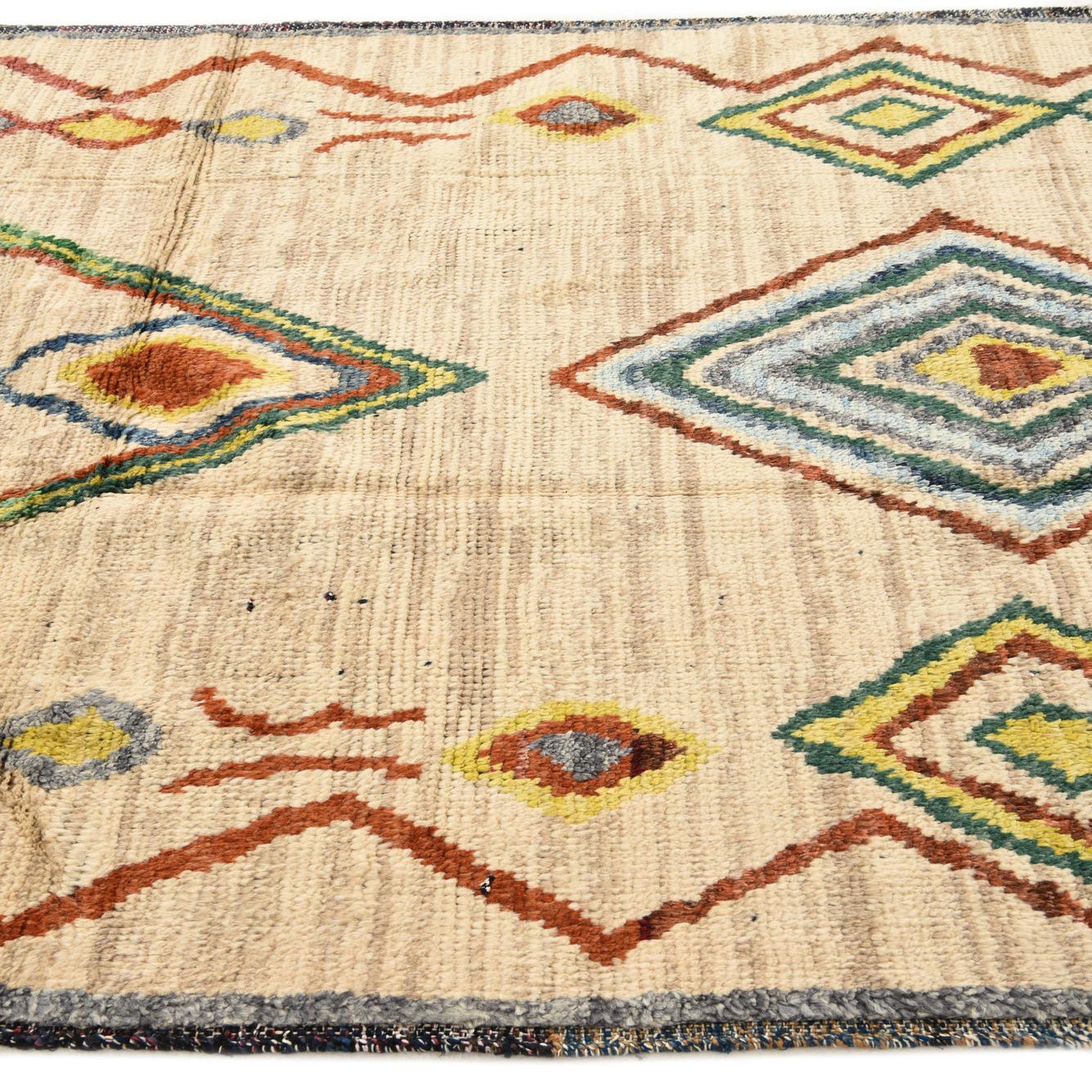 A 6x9 rectangular Moroccan shag rug with a cream background and colorful tribal diamond patterns in red, green, blue, and yellow.