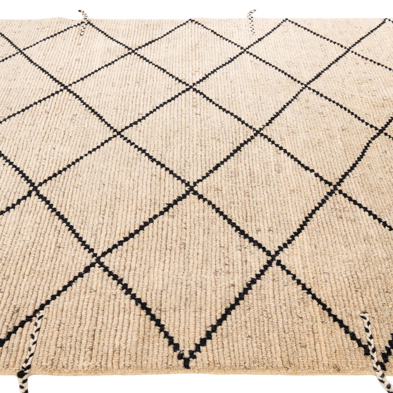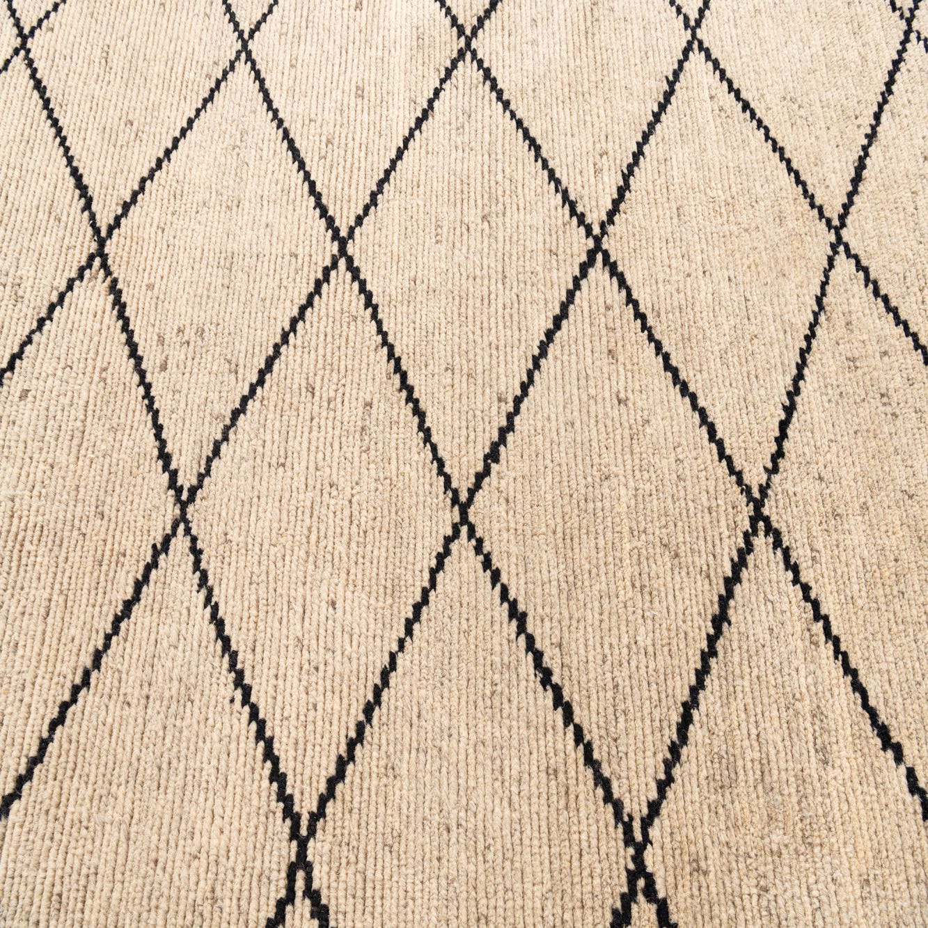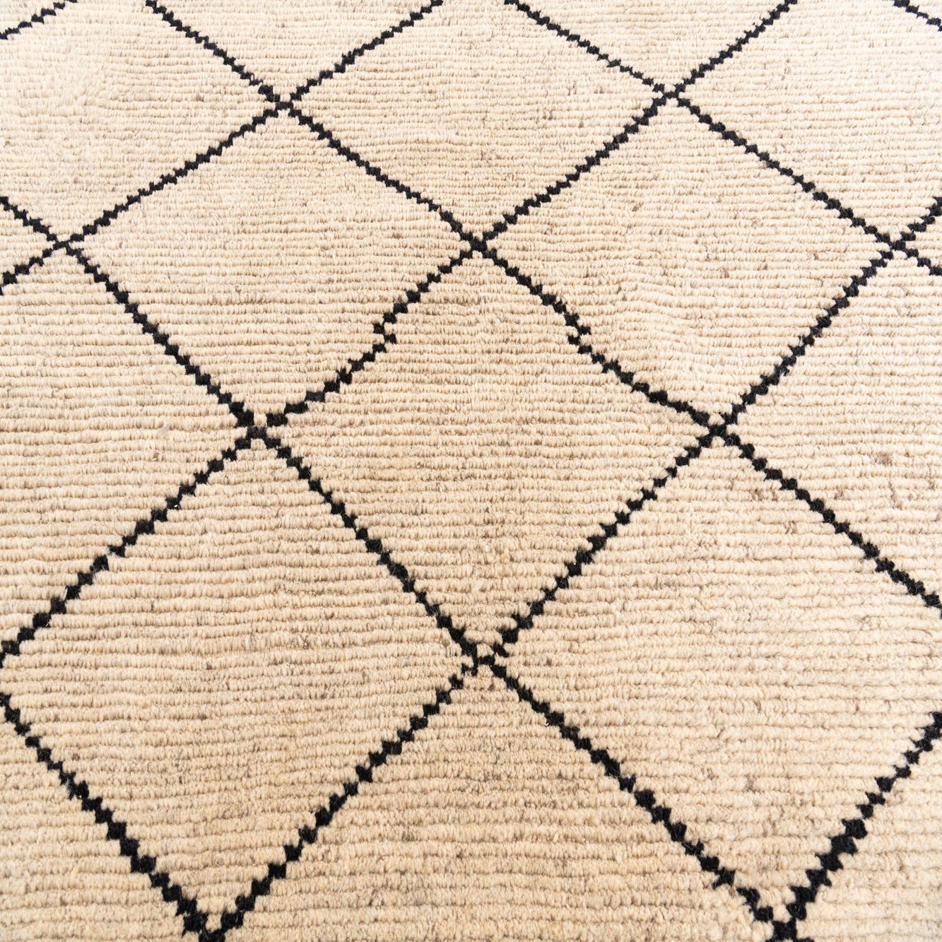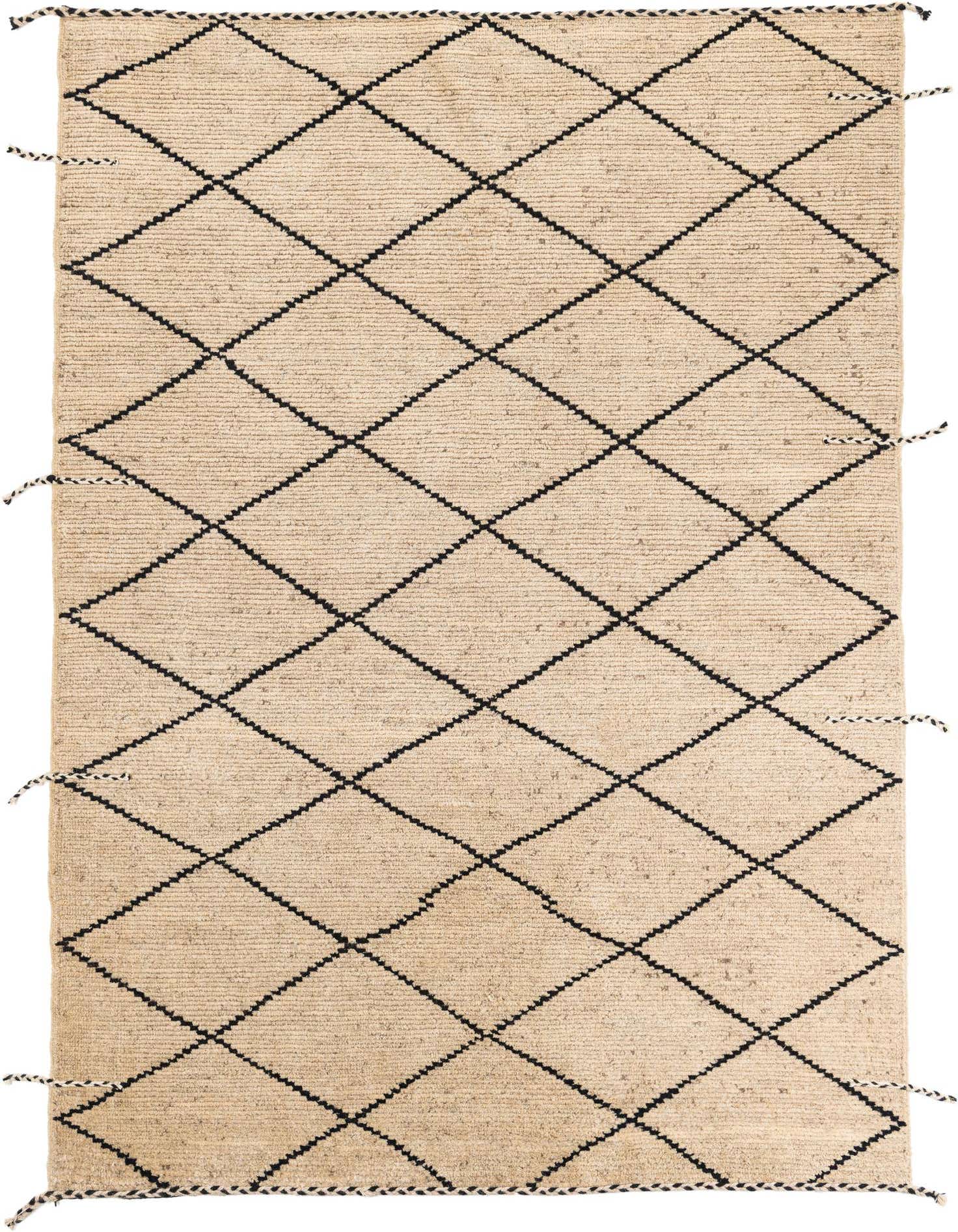 A 6x9 rectangular Moroccan shag rug with a cream background and a black tribal diamond pattern.