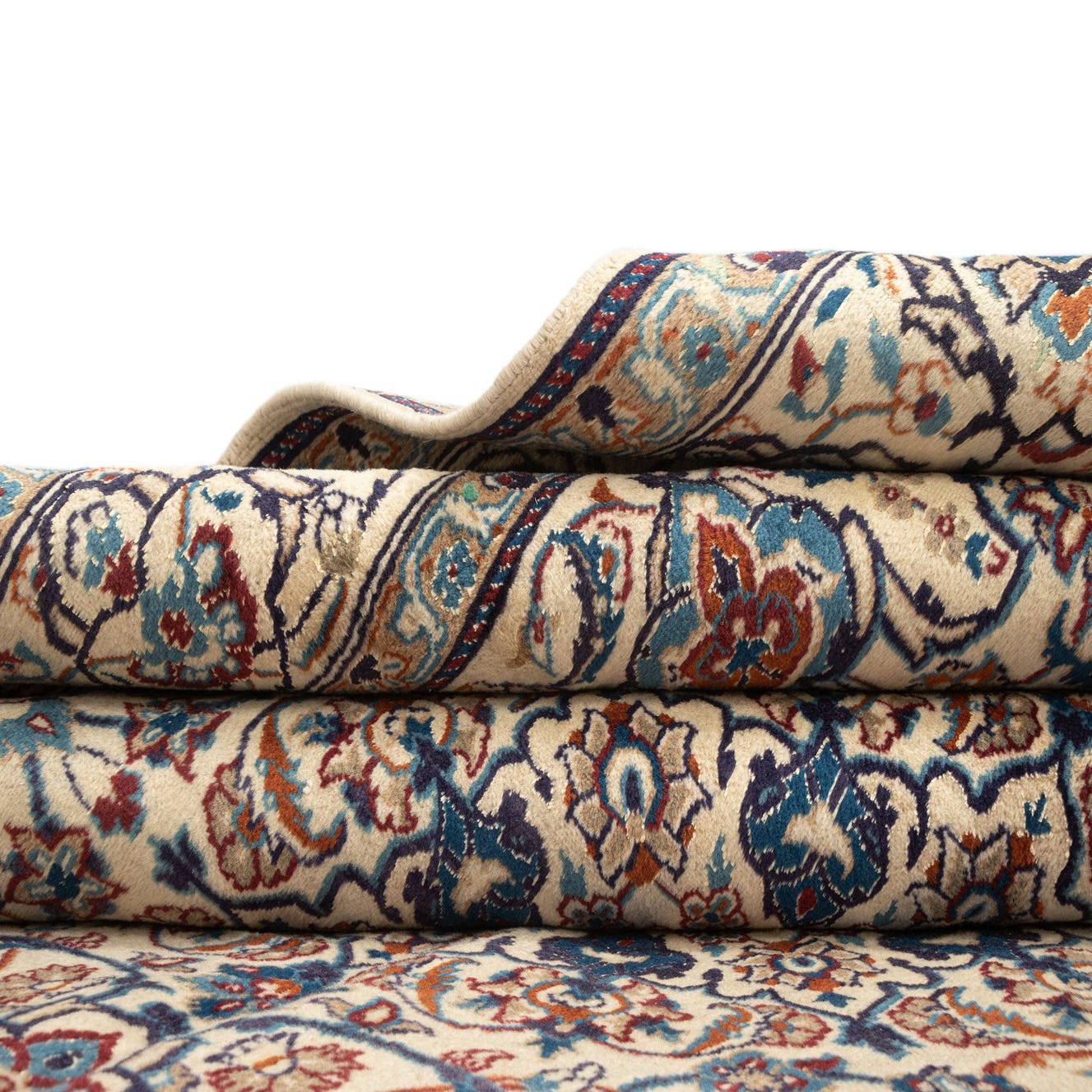 A 6x9 rectangular Persian rug with a cream background, intricate floral patterns in blue and brown, and a detailed border.