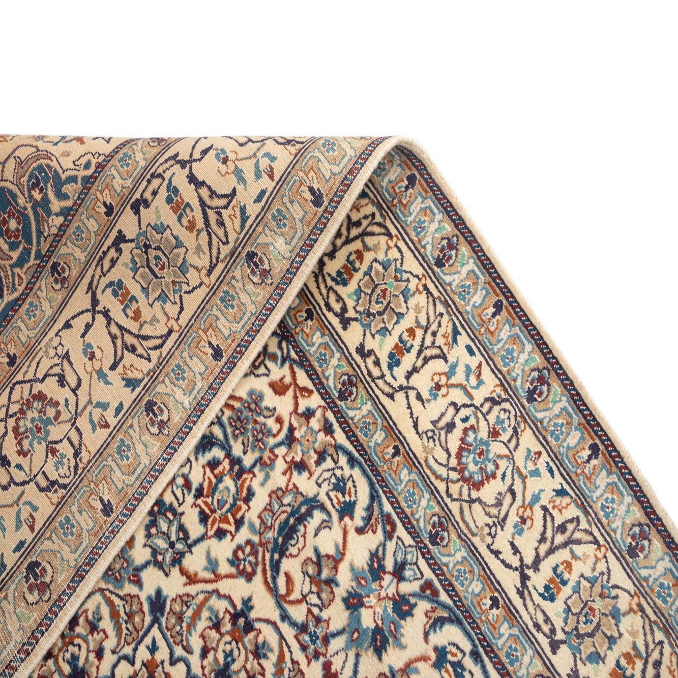 The ornate border frames the central pattern, creating a well-defined and structured appearance, making it an ideal choice for interiors seeking a touch of formal beauty. This rug's versatile color scheme allows it to blend seamlessly into various decor styles, from classic and traditional to transitional spaces that balance old-world charm with contemporary flair. It would be well-suited for a dining room, living area, or office that aims to create a refined and welcoming atmosphere. The Nain rug's classic design and rich hues would complement wooden furnishings, leather accents, and decorative elements in gold or brass, enhancing the overall aesthetic of the room.