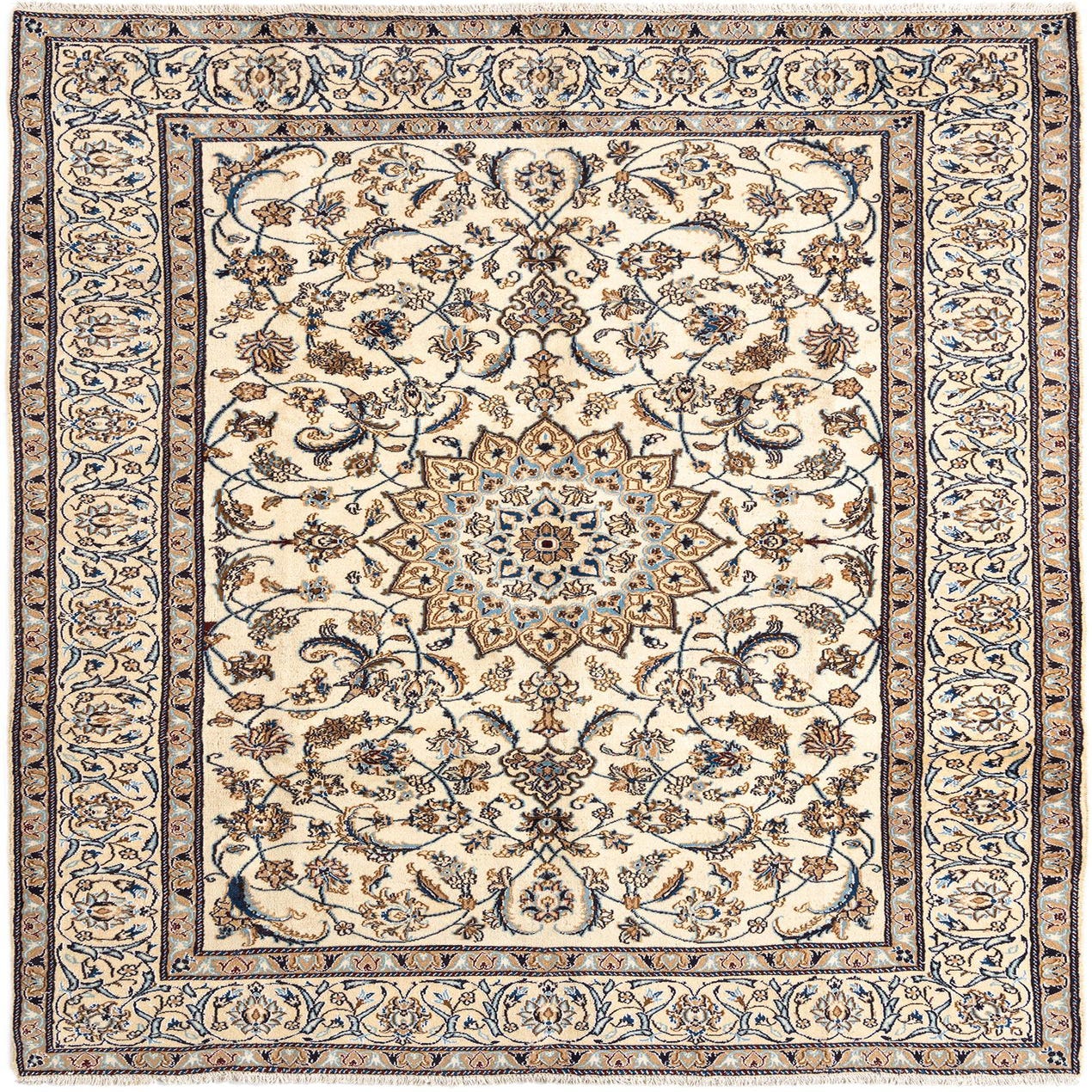 A 6x9 rectangular Persian rug with an ivory field, intricate floral patterns, and a central medallion in blues and browns.