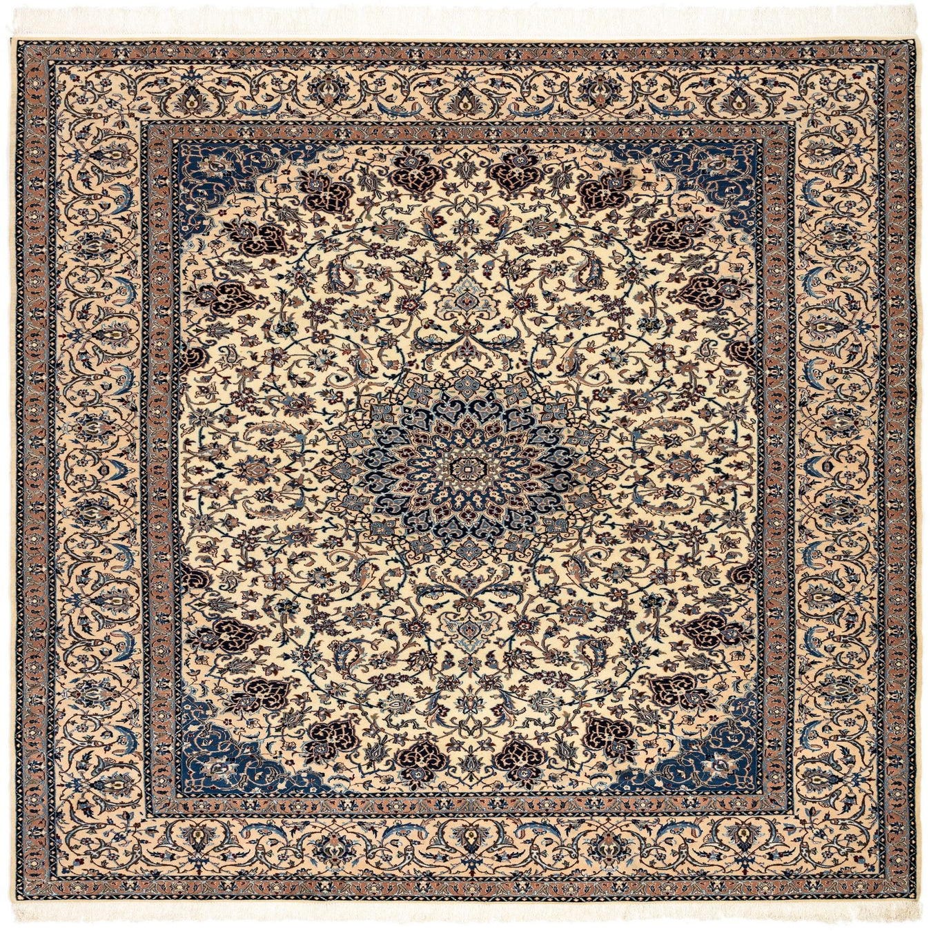 The Nain Collection offers a hand-made wool rug featuring a sophisticated harmony of beige, blue, and brown hues. Embracing traditional design, the piece showcases a central medallion pattern surrounded by a field of intricately detailed florals and vine motifs, leading to a complementary border that frames the rug beautifully. The elegant color palette set against the beige background ensures this rug will create a refined ambience in any space.