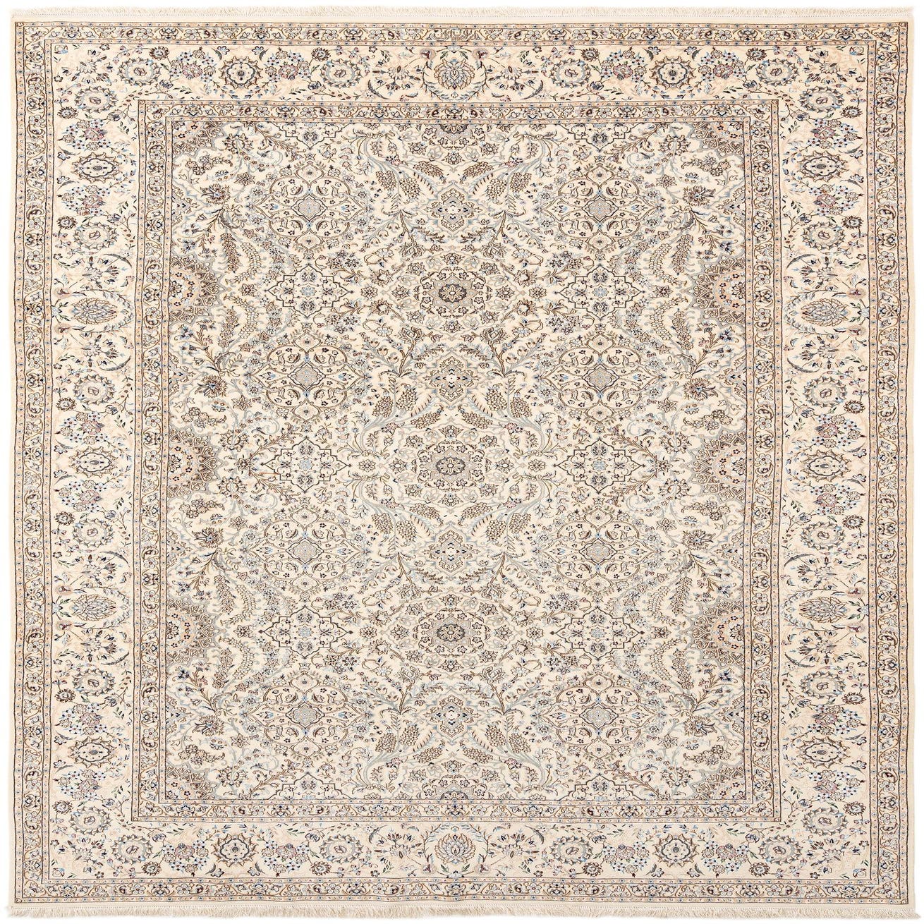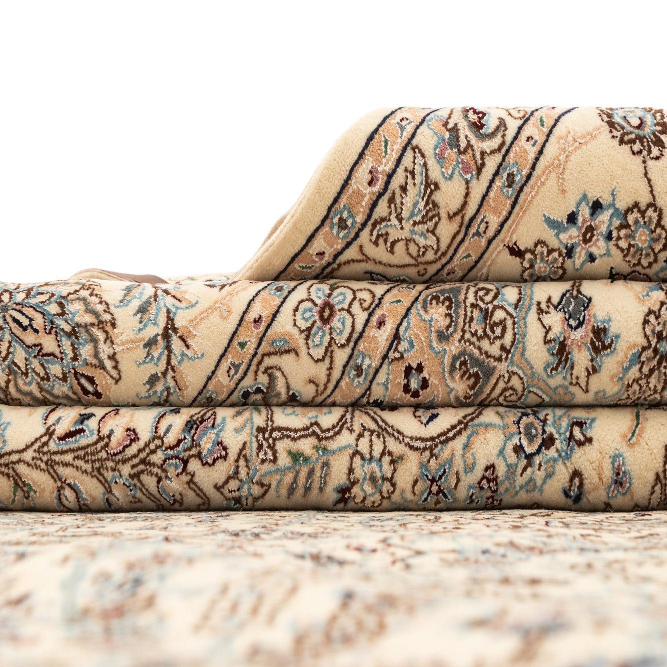 A 6x9 rectangular wool rug in ivory and cream with a traditional floral pattern and intricate brown and blue details.