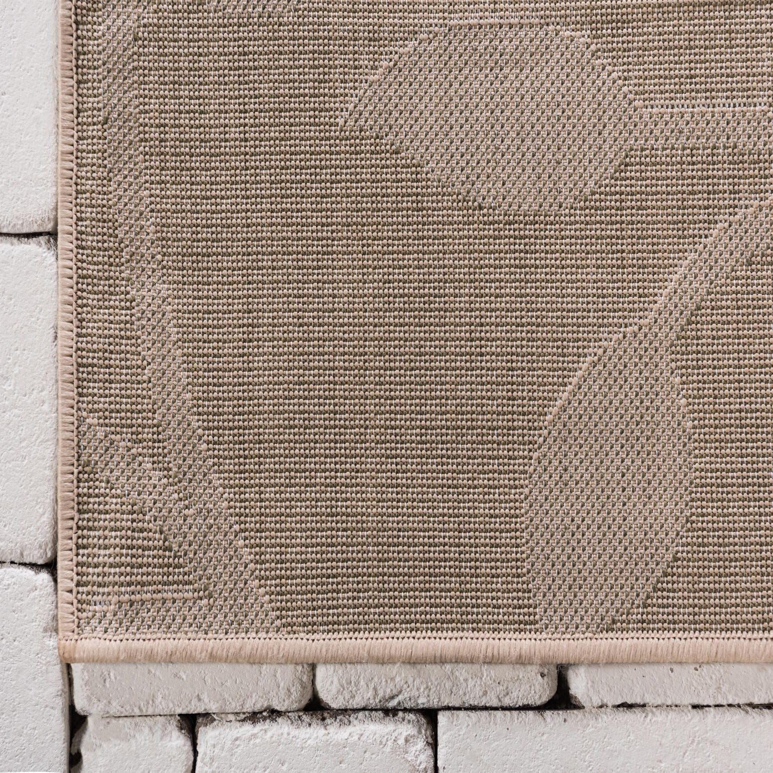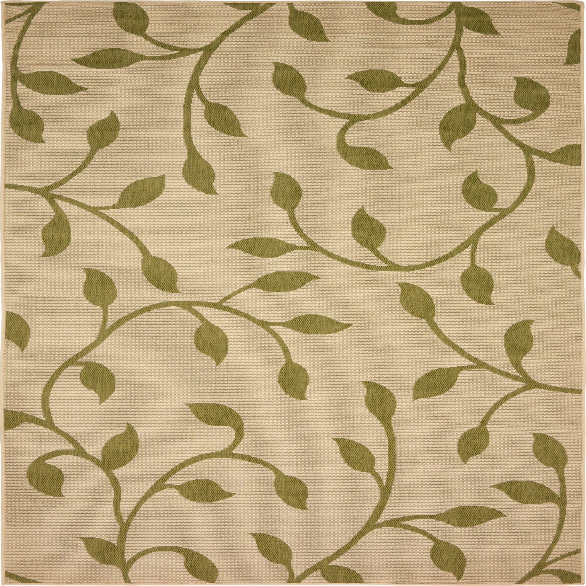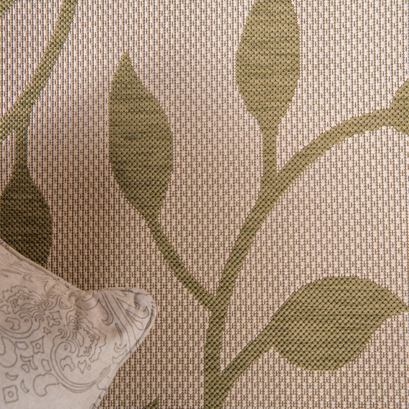 Machine-made using 100% polypropylene, this rug pairs a warm beige ground with a flowing green leaf-and-vine pattern for a fresh, nature-inspired look. The design shows gently curving stems and simple, teardrop leaves spaced across the field, while the background has a subtle, low-profile ribbed texture that contrasts with the slightly raised leaf motifs. The surface feels smooth underfoot with just enough texture to add visual depth without a heavy pile.