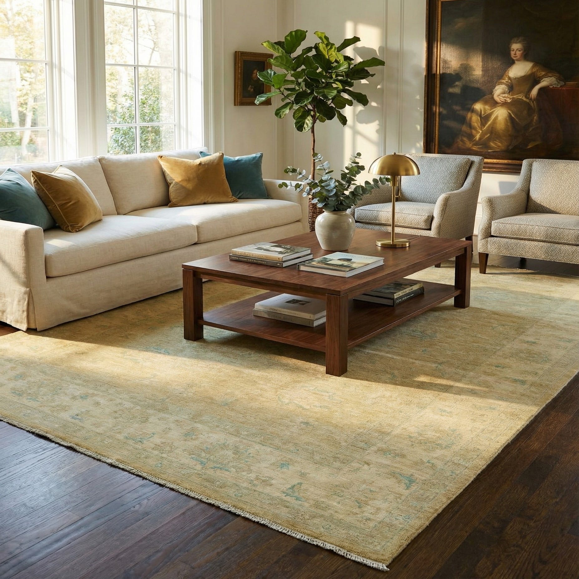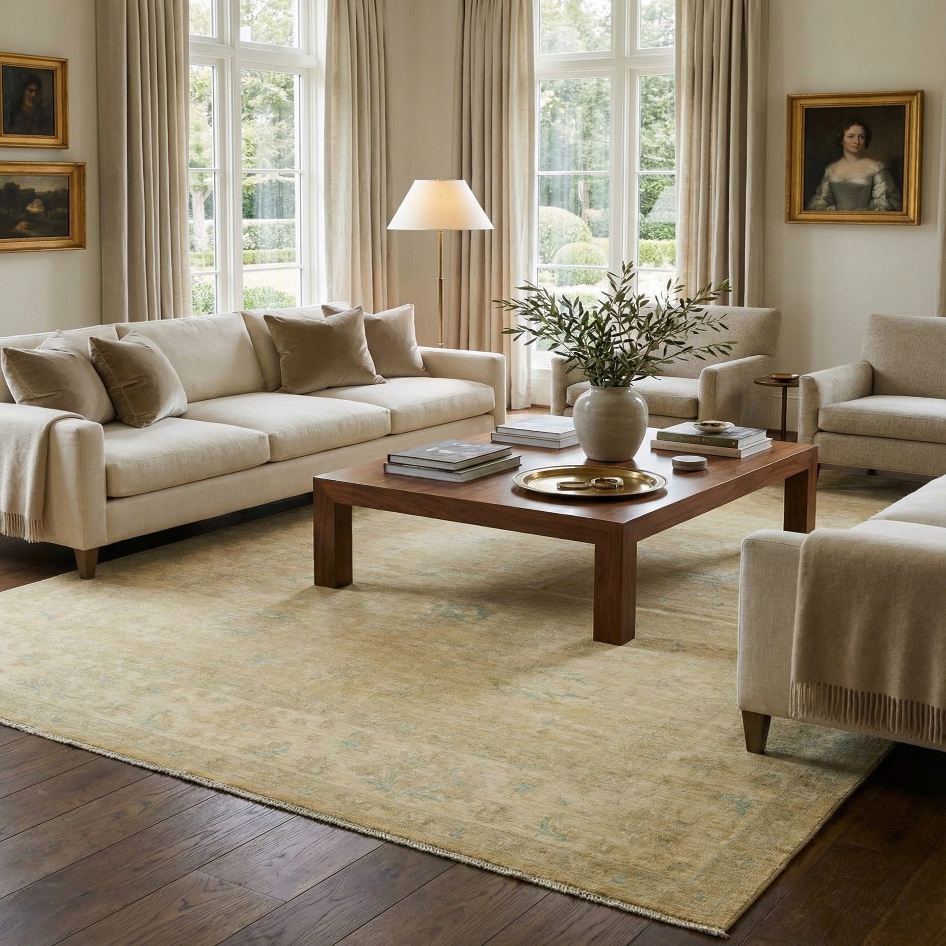 A soft beige field sets a calm foundation for this hand-knotted rug, where cream and light blue floral motifs and light brown accents appear in a low-contrast, gently faded pattern. The design keeps ornamentation restrained — faint medallion shapes and a broad border with scattered floral elements create a timeless, worn-in look. Hand-knotted of 100% hand-spun wool, the pile has a warm, dense feel underfoot; running your hand across it reveals subtle variations in texture and tone from the hand-spun yarns and a low-sheen surface that softens the pattern.