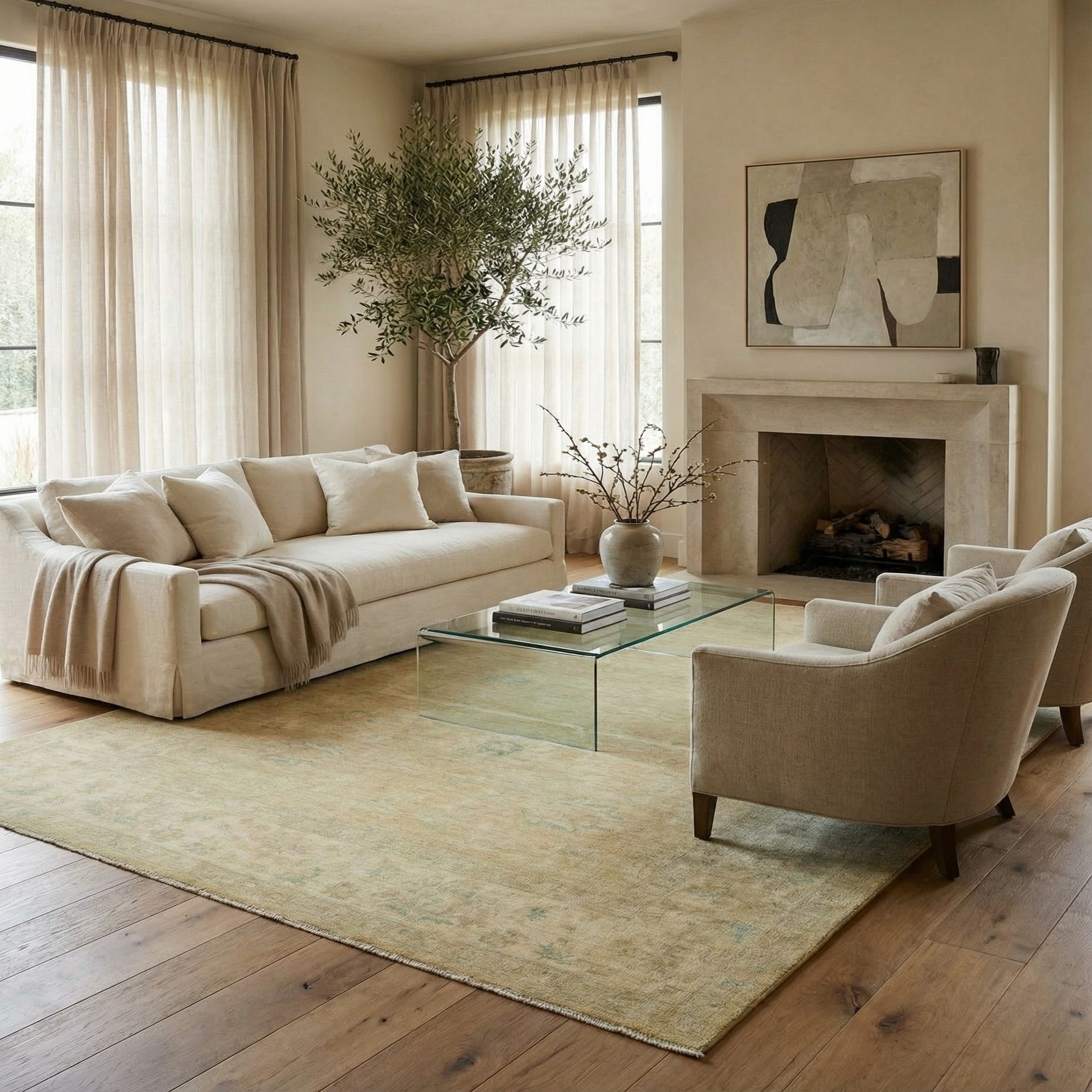 The rug pairs naturally with neutral, coastal, Scandinavian, or transitional interiors and works well as an anchor for a seating area or beneath a coffee table, bringing quiet warmth to a bedroom, home office, or small dining space. Its muted palette complements light wood floors, linen upholstery, woven textures, and both warm-metal and matte-finish accents, making it easy to layer into relaxed, lived-in schemes that favor soft color and tactile materials.