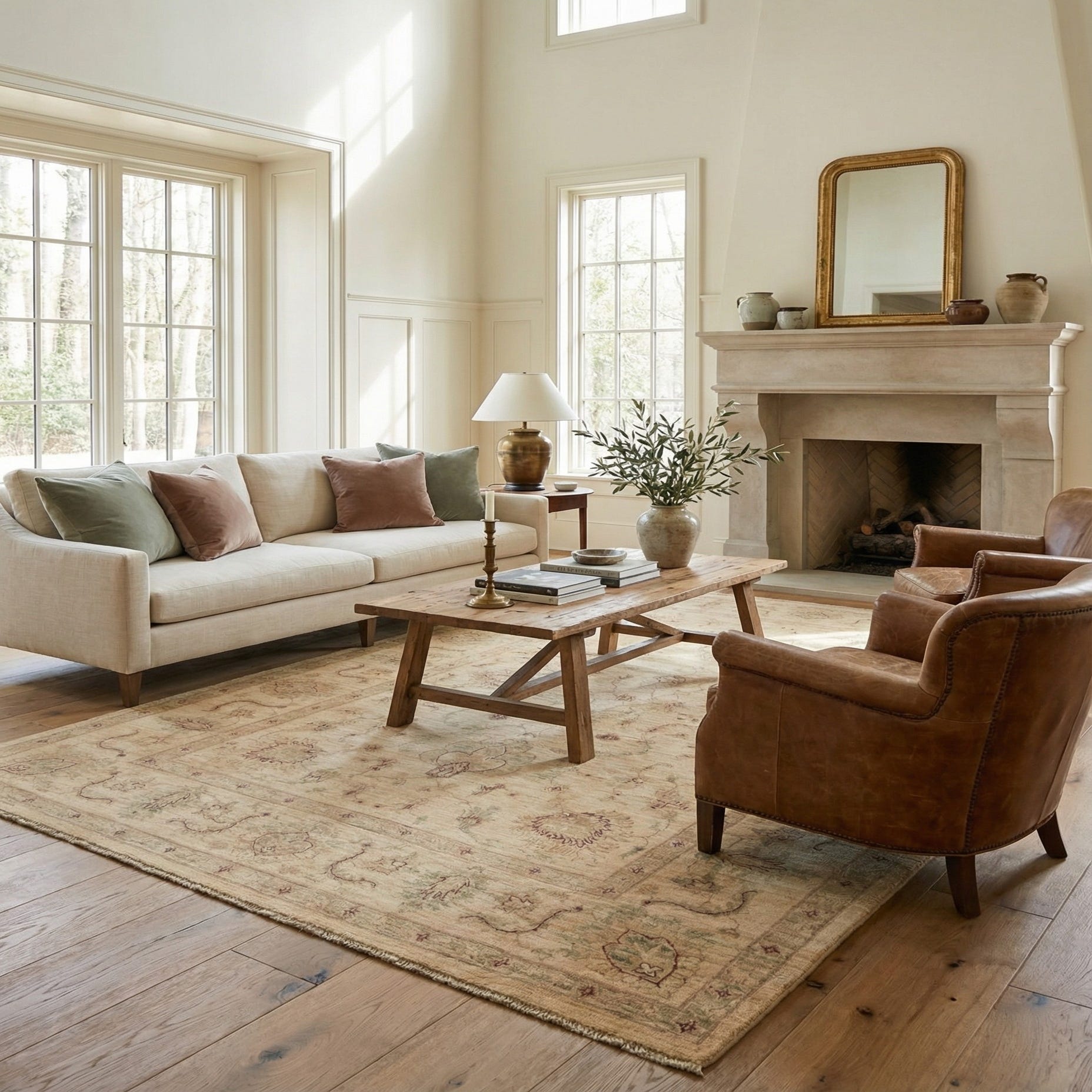 A 6x9 rectangular Peshawar Ziegler rug in warm browns and tans with a traditional botanical pattern, ideal for a living room.