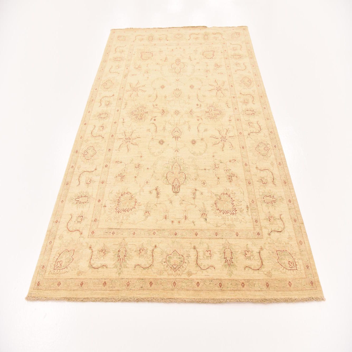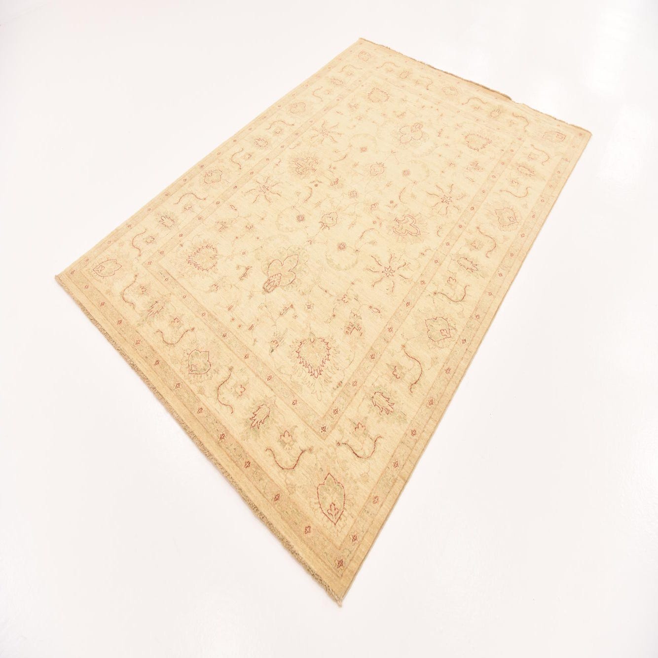 The Peshawar Ziegler Collection offers a 6x9 hand-knotted rug crafted from 100% hand-spun wool, providing both comfort and durability. This rug presents a beige background adorned with floral and botanical motifs in a harmonious blend of colors including burgundy, cream, light green, olive, and peach. The intricate pattern features a central medallion surrounded by an array of stylized foliage and palmettes, with a complementary border that frames the design elegantly.
