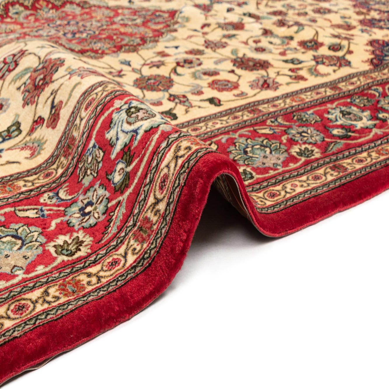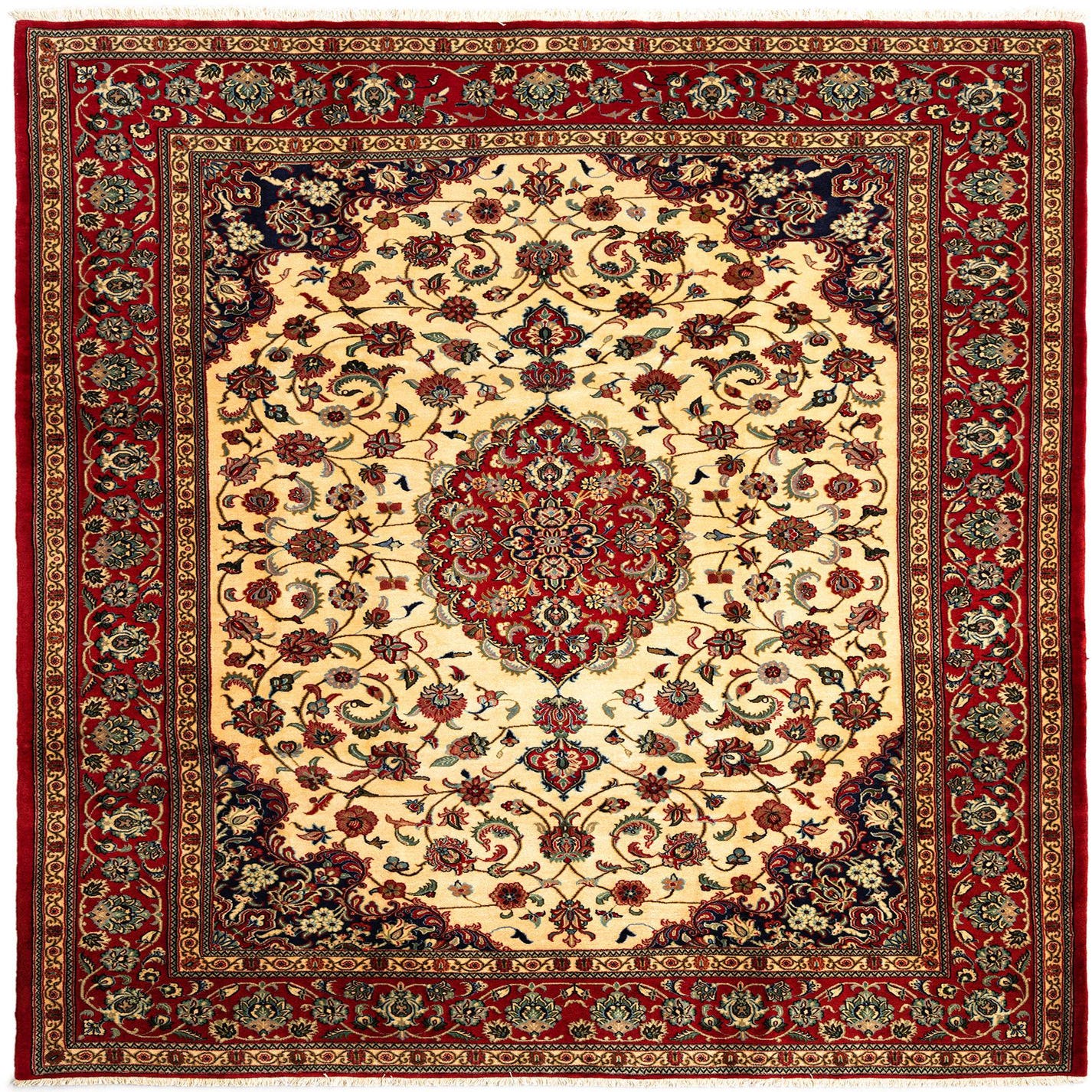 A 6x9 rectangular Persian rug with a cream field, red border, and intricate floral medallion pattern.