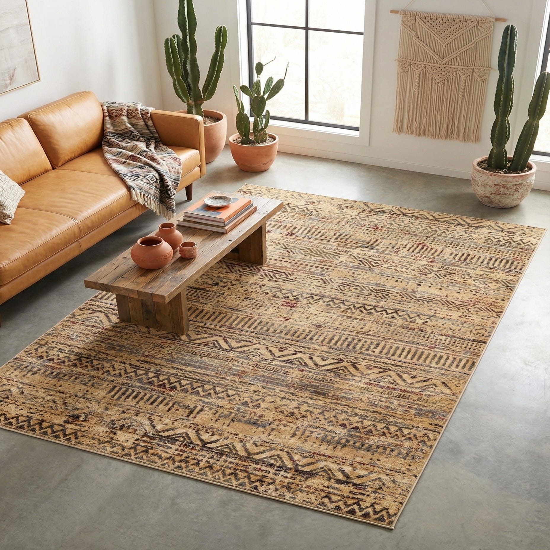 This rug pairs well with warm wood and leather furnishings for a relaxed, lived-in look, and also complements neutral linen sofas or crisp, modern case goods when you want to introduce pattern without overwhelming the space. Use it in a living area under a coffee table, centered in a seating grouping, or in an entry or home office to anchor the room. Its tonal palette and textural interest suit transitional, rustic, bohemian, or casual contemporary interiors.