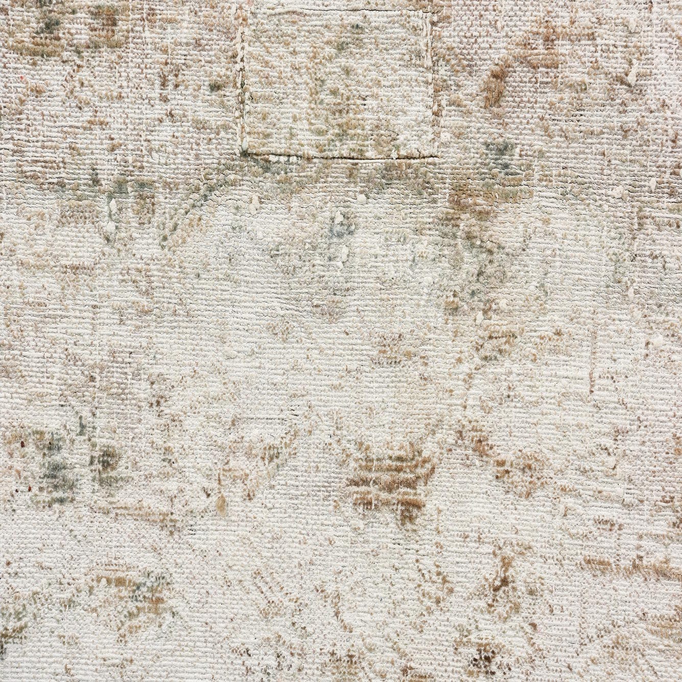 A soft, vintage-inspired pattern rests on a warm beige ground, where a gently distressed field and faint border reveal layers of ivory and brown with subtle navy blue accents woven through the motifs. The hand-knotted construction in 100% wool creates a dense, slightly plush surface that feels warm underfoot and responds to touch with a natural, tactile give. The worn, low-contrast finish keeps the design understated while still offering clear antique character and fine knot detail.