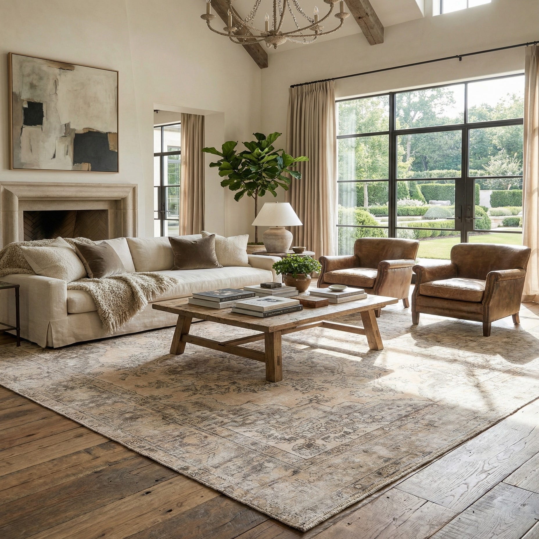 This piece pairs naturally with warm wood floors, linen-upholstered seating and brass or matte black metal accents, making it a good anchor for traditional, transitional, or relaxed modern interiors. Place it beneath a living-room seating group to define the conversation area, lay it under a bed to add softness on waking, or use it in a dining room to soften a hardwood floor — the muted palette and soft texture support layered, neutral schemes as well as rooms that mix antique and contemporary furnishings.