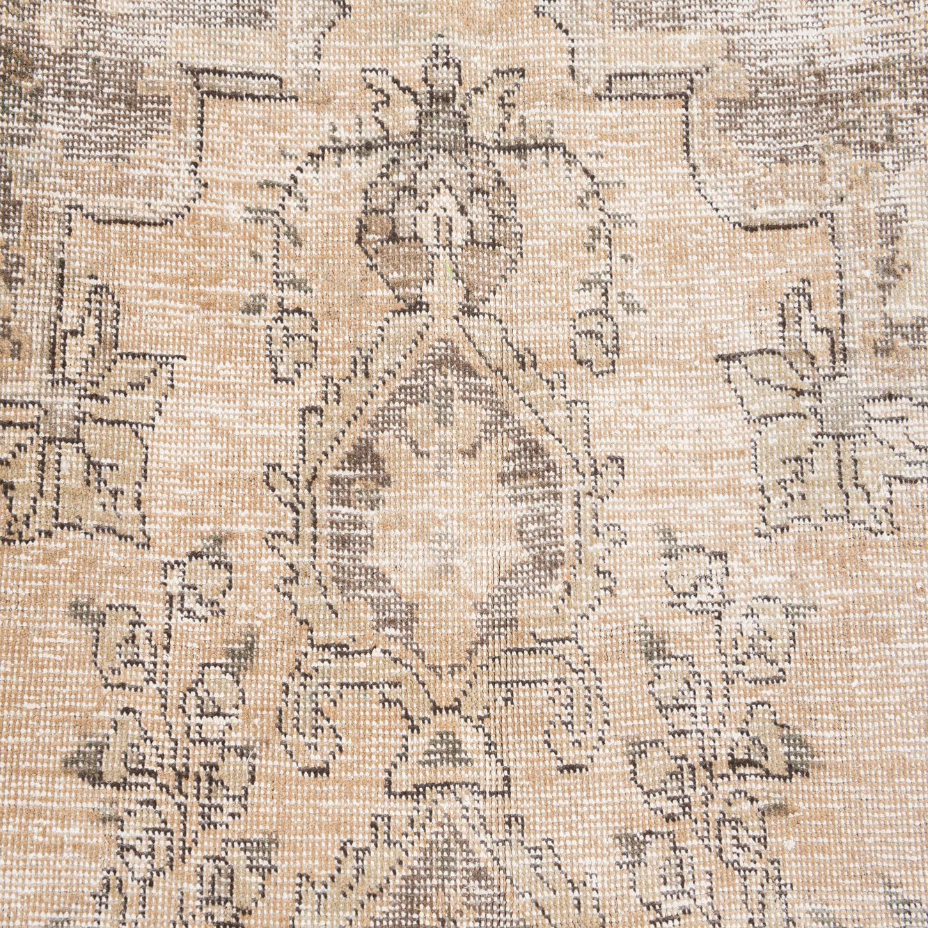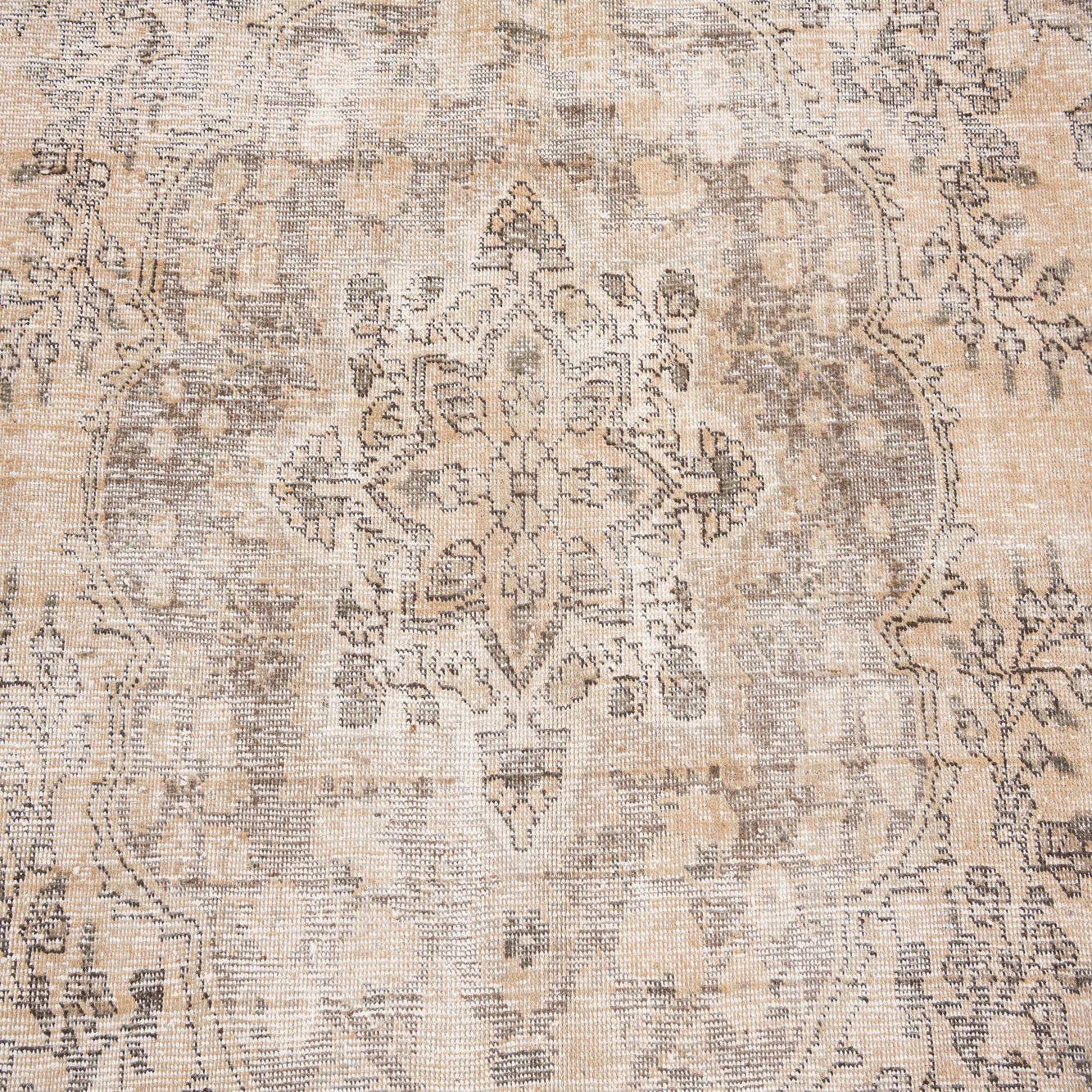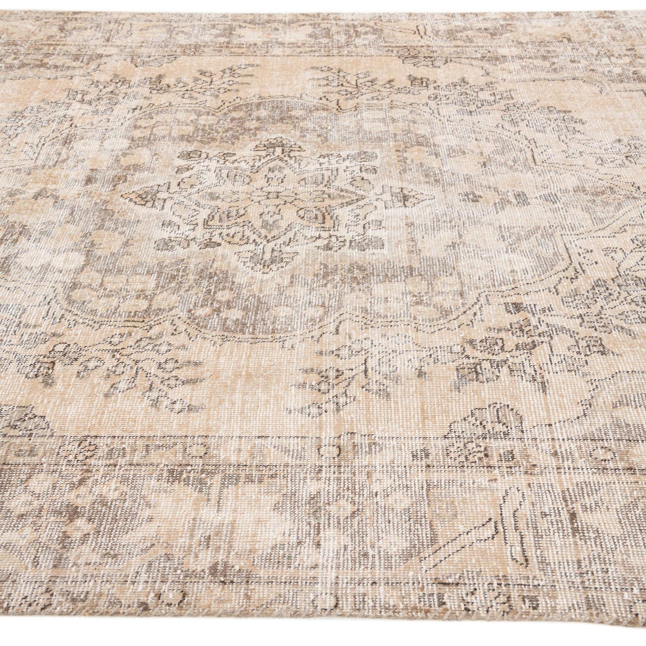 A soft, timeworn medallion pattern rests on a warm beige field, where antique-inspired florals and scrolling vines appear gently faded into the background. Subtle ivory highlights and deeper brown accents define the central motif and border, creating a quiet, layered look that reads as well-traveled rather than bold. Hand knotted from 100% wool, the surface has a tactile, slightly plush feel with a low-to-medium pile that gives the rug a comfortable, grounded presence underfoot.