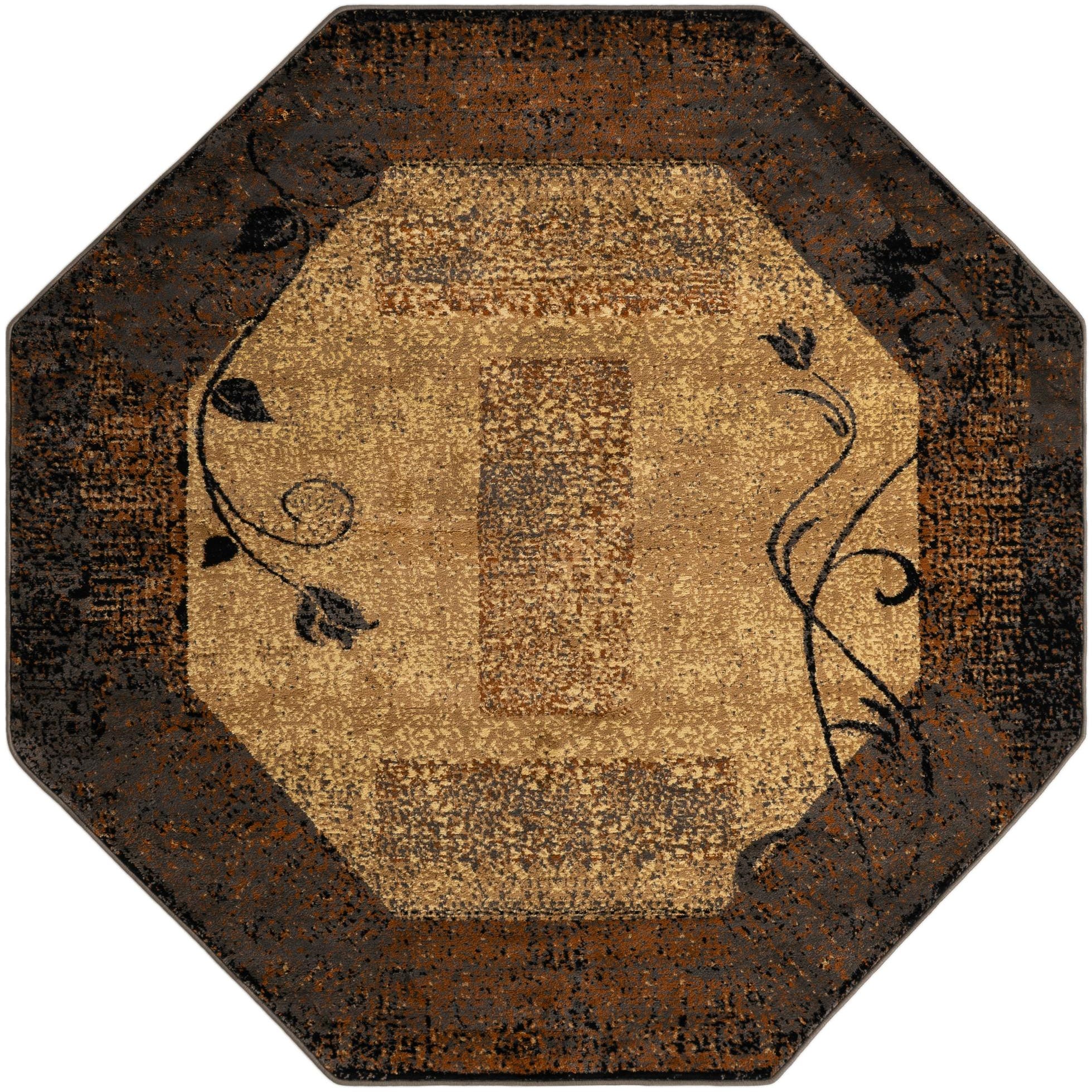 A warm beige field anchors this octagonal rug, its surface worked in a distressed, speckled pattern of brown, gray and subtle blue threads that add depth without overwhelming. A broad, darker border frames the center and carries graceful black vine-and-leaf motifs with hints of olive and burgundy woven into the design. Machine-made from 100% polypropylene, the rug has a low-pile, dense weave that feels smooth underfoot while showing clear surface detail and color variation.
