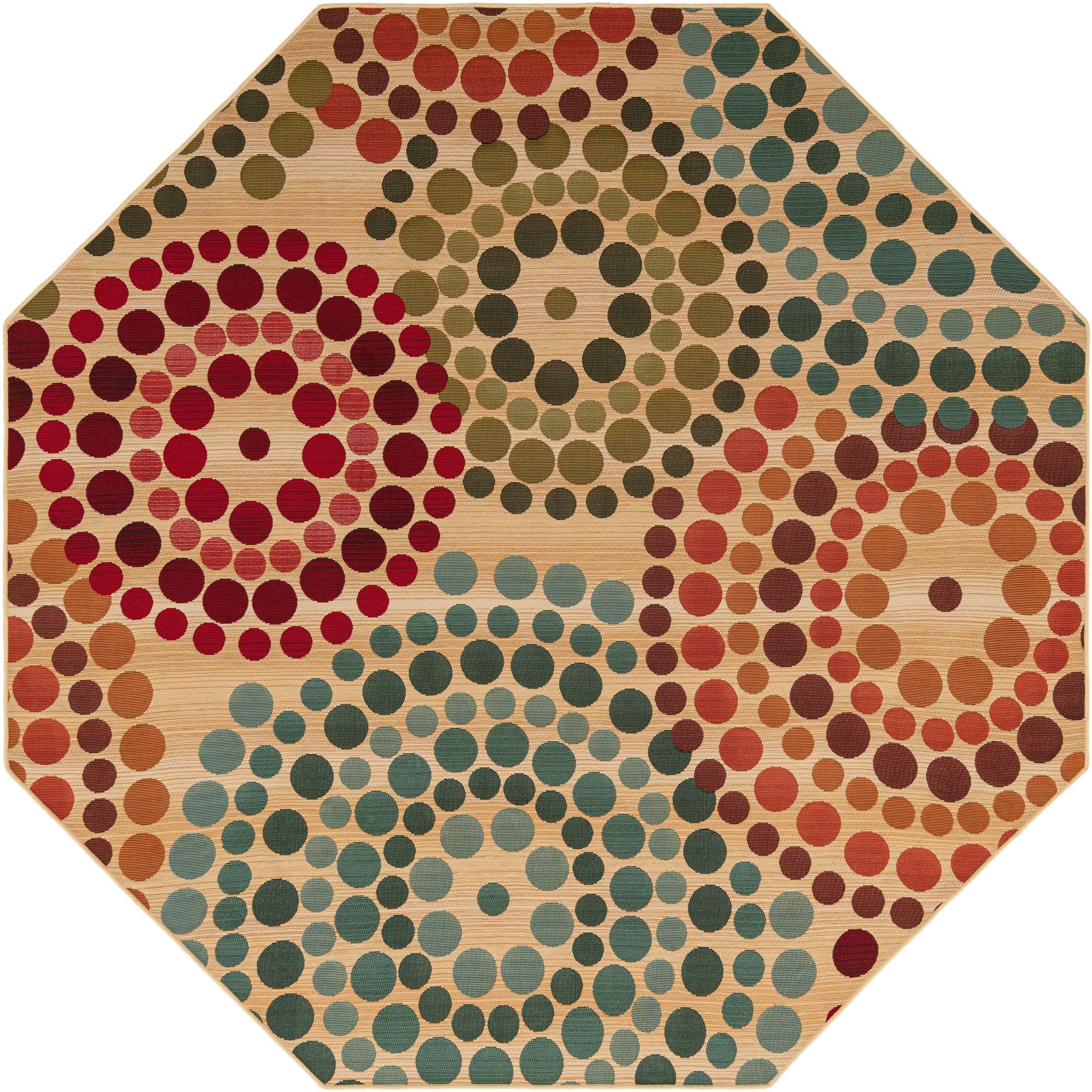 7' 0 x 7' 0 Octagon Rugs.com Outdoor Modern rug with a tan background and a vibrant abstract pattern of red, teal, and brown circles.