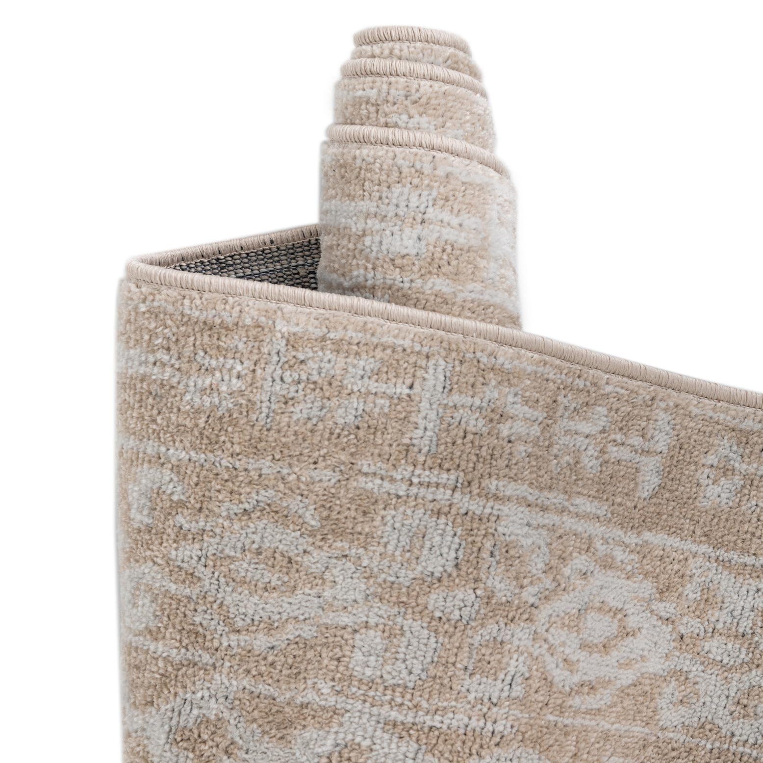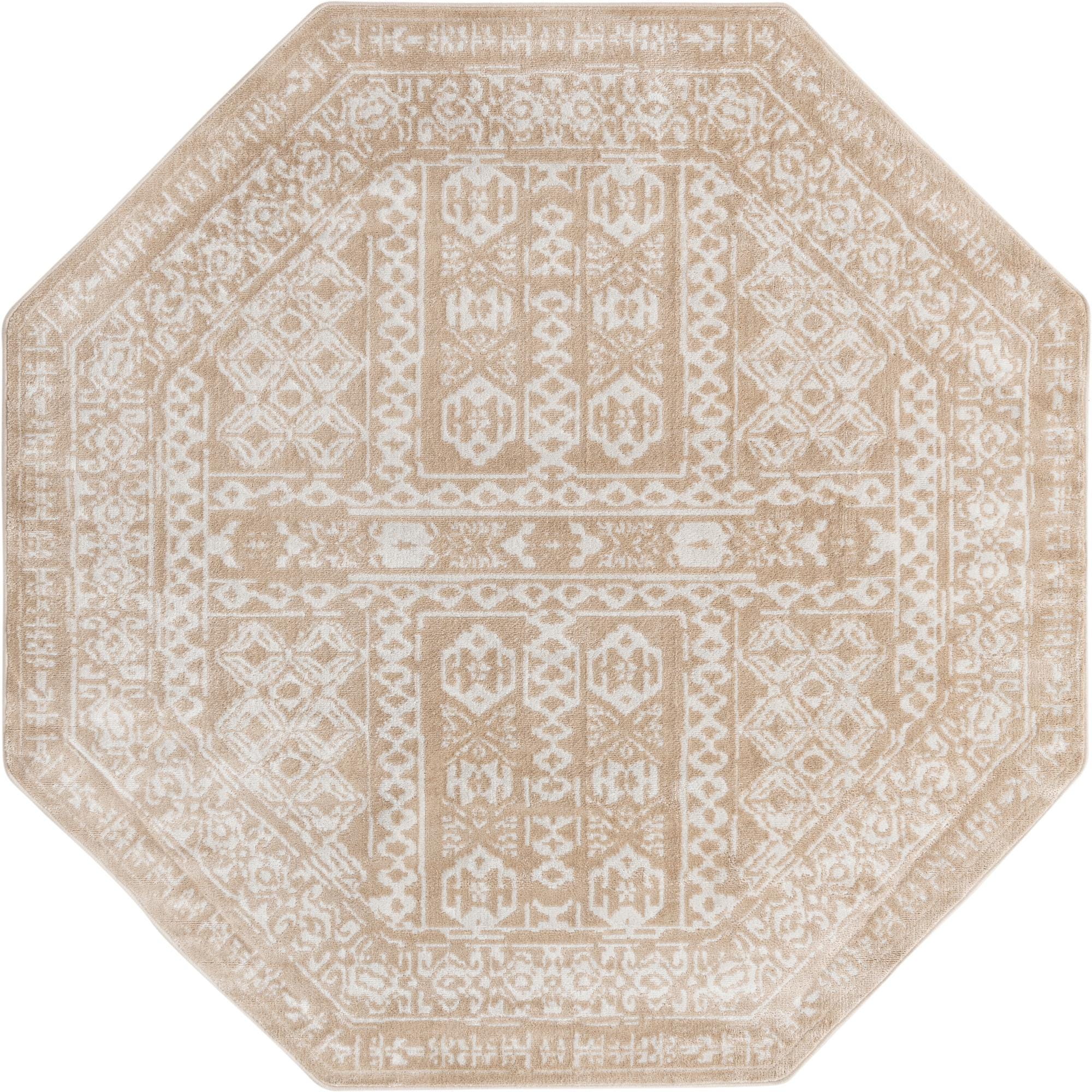 A soft, low-profile octagonal rug with a warm beige ground and an ivory, vintage-inspired motif. The design blends small-scale geometric medallions and linear border work to create a balanced, traditional pattern with a gentle, worn effect. Machine made from 100% polypropylene, the surface has a smooth, slightly dense pile that feels soft underfoot while keeping the pattern clearly defined and subtly dimensional.