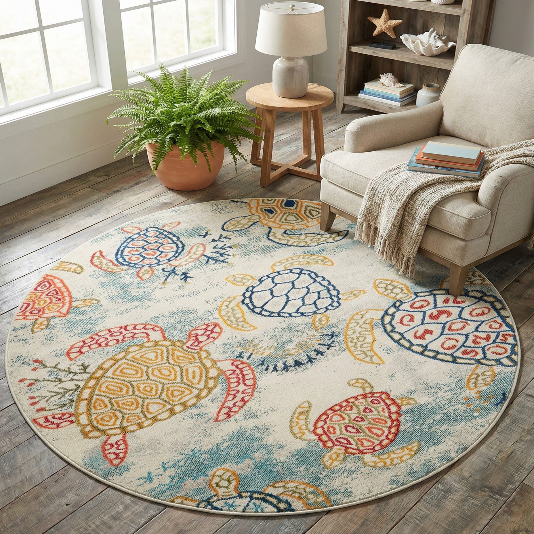 A playful coastal motif anchors this round rug: hand-drawn sea turtles glide across a beige background washed with painterly strokes of blue, gray, and green that suggest gentle water movement. Each turtle is outlined and detailed in navy, gold, tan, orange, and red-toned accents, creating a lively but balanced palette against the neutral field. The pattern reads casual and modern, with a slightly graphic, illustrative quality that adds personality without overwhelming a room.