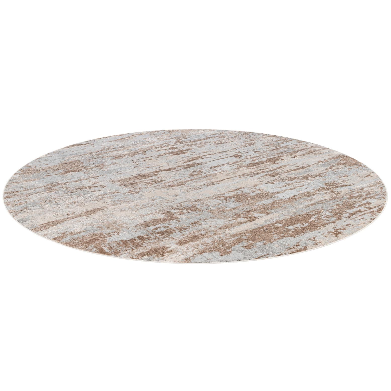 A 7' round modern abstract rug with a textured pile, featuring mottled browns, tans, ivories, creams, and light blues.