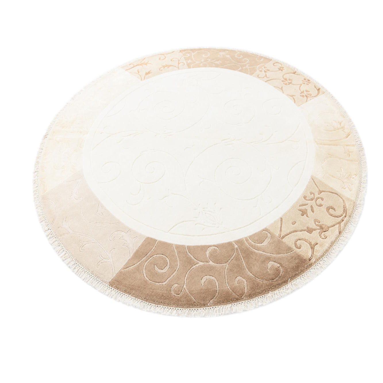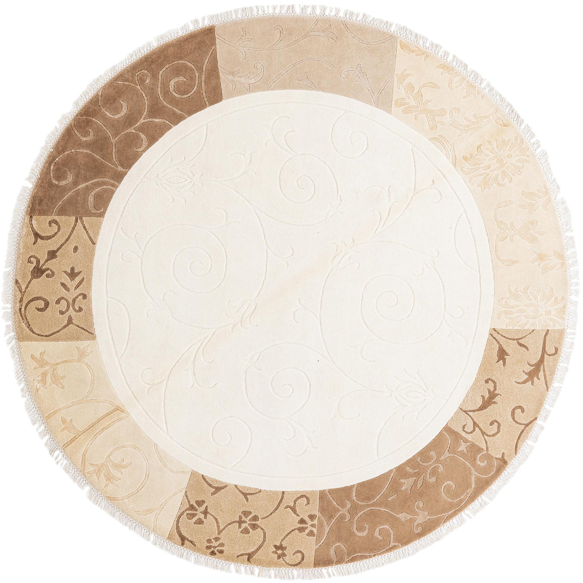 Rugs.com Darya 6' 7 x 6' 7 Round rug featuring a cream center with subtle scrollwork, surrounded by a border of alternating brown and tan panels with oriental patterns and fringe.