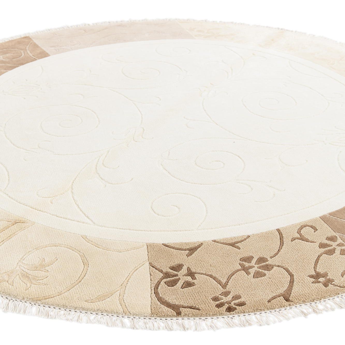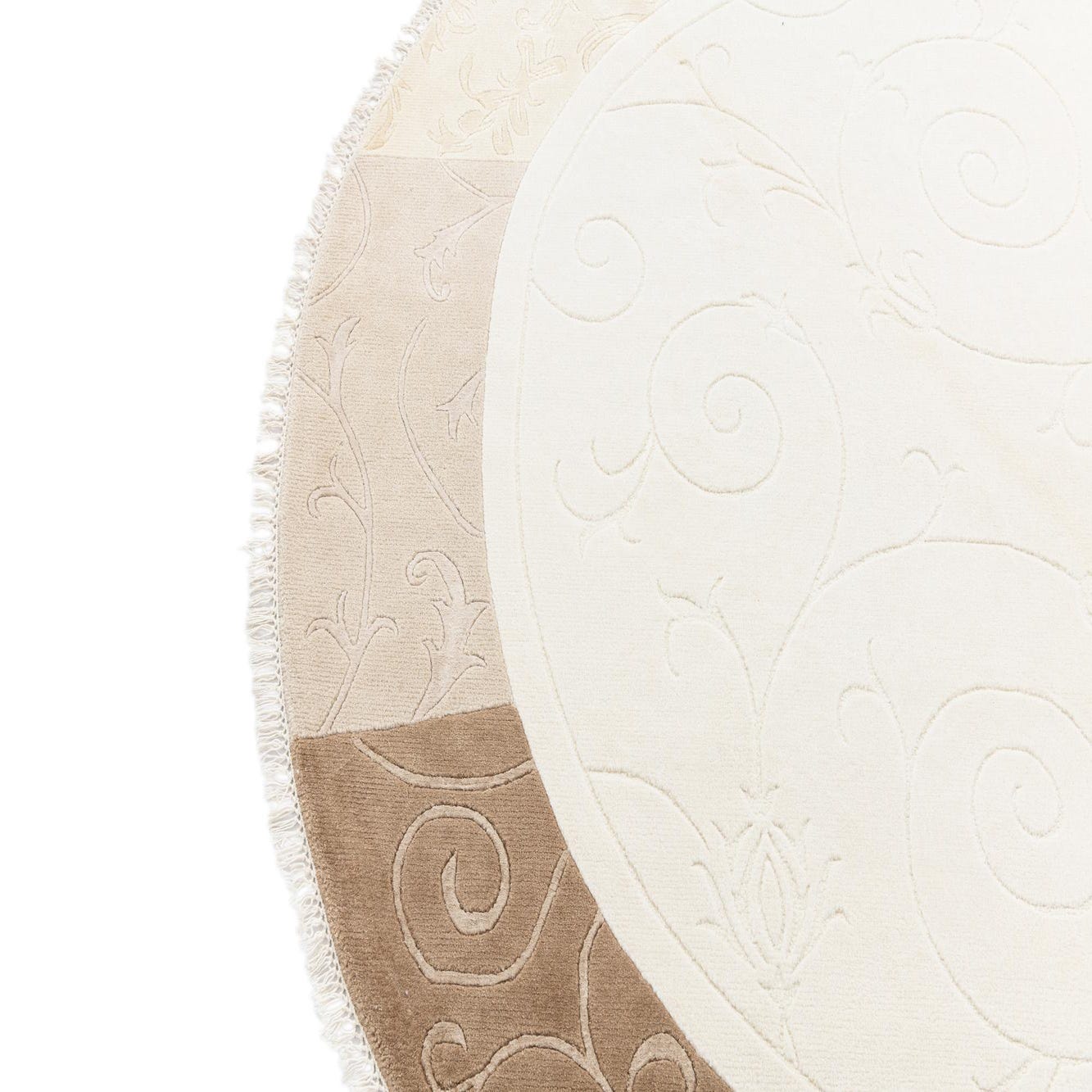 With its organic color scheme and intricate design, this rug would seamlessly integrate into interiors that emphasize natural materials and subtle elegance. It would serve as a graceful anchor in spaces like a refined living room, an intimate reading nook, or beneath a round dining table. The wool construction ensures that this piece has a natural resilience to wear, making it well-suited for areas with moderate foot traffic.