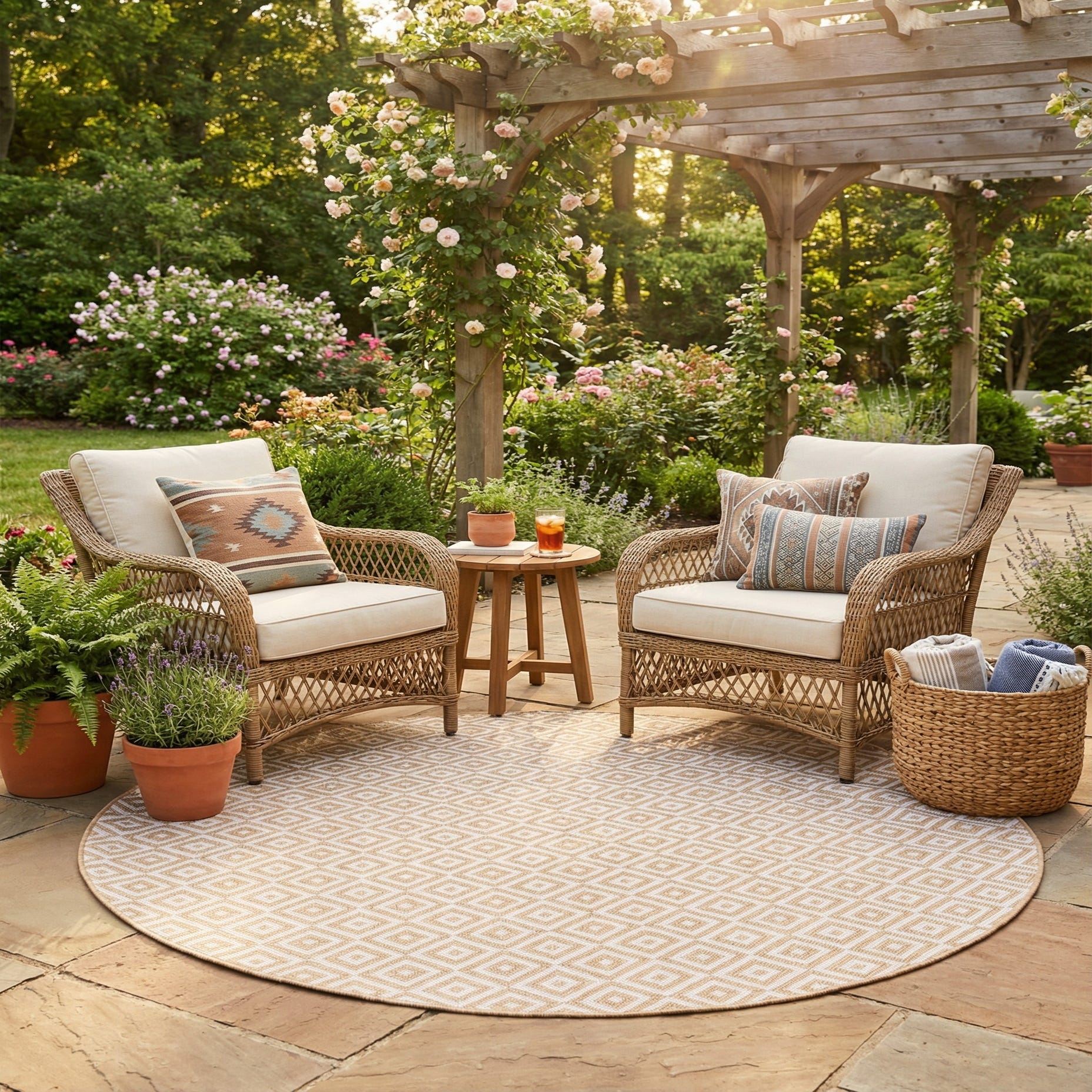 This rug is well suited to outdoor living spaces like a covered patio or screened porch and also transitions comfortably to indoor areas such as a casual dining nook, entry, or sunroom. Pair it with rattan or teak seating and linen cushions for a relaxed coastal vibe, combine it with light-washed woods and soft textiles for Scandinavian-inspired rooms, or use it to soften a modern setting with metal accents and streamlined furnishings.
