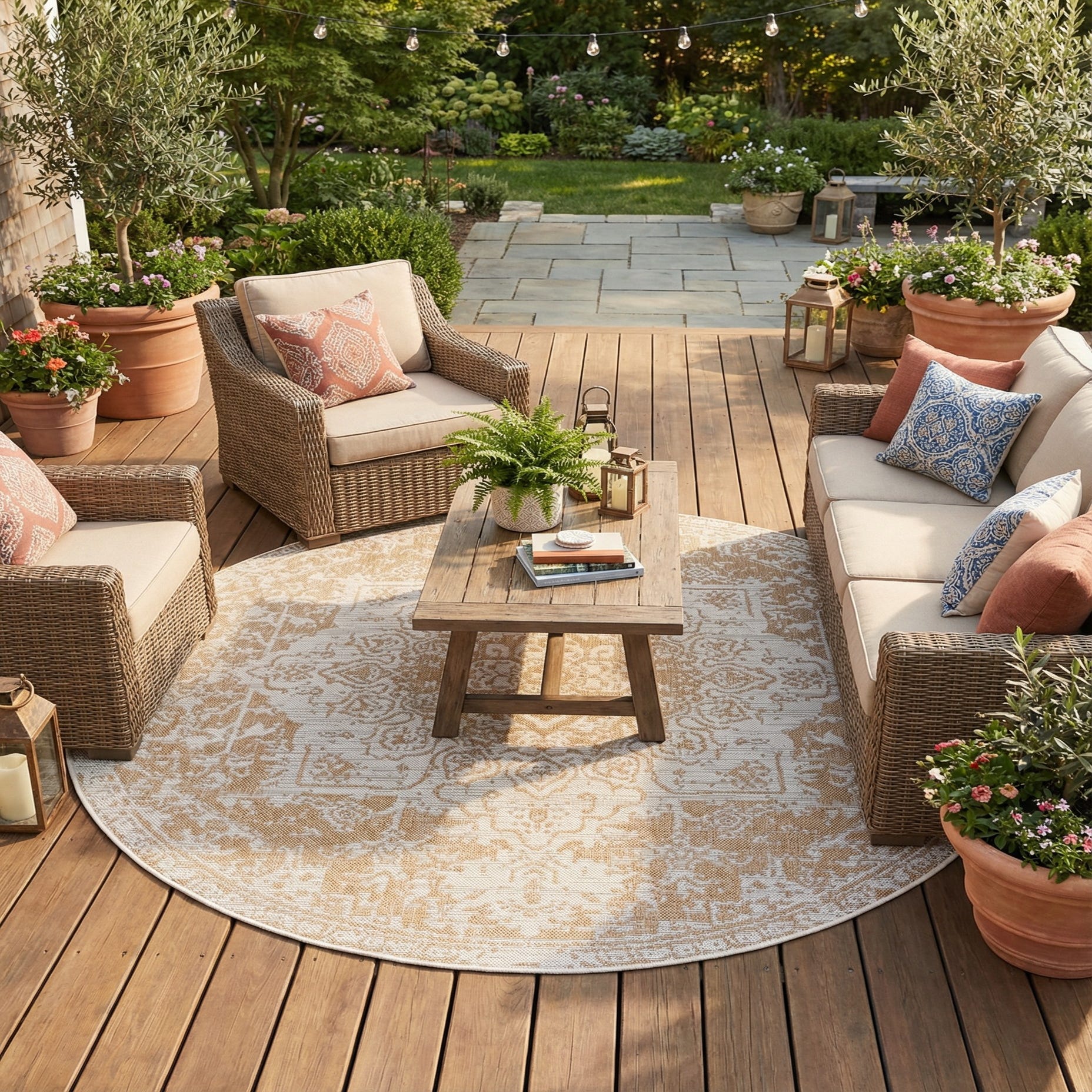 This piece works well on a covered patio or sunroom, under a round bistro table, or as an anchor in a casual dining nook. The neutral beige and brown palette pairs easily with natural woods, rattan or wicker furnishings, and linen textiles, fitting styles from coastal and farmhouse to transitional and relaxed traditional interiors.