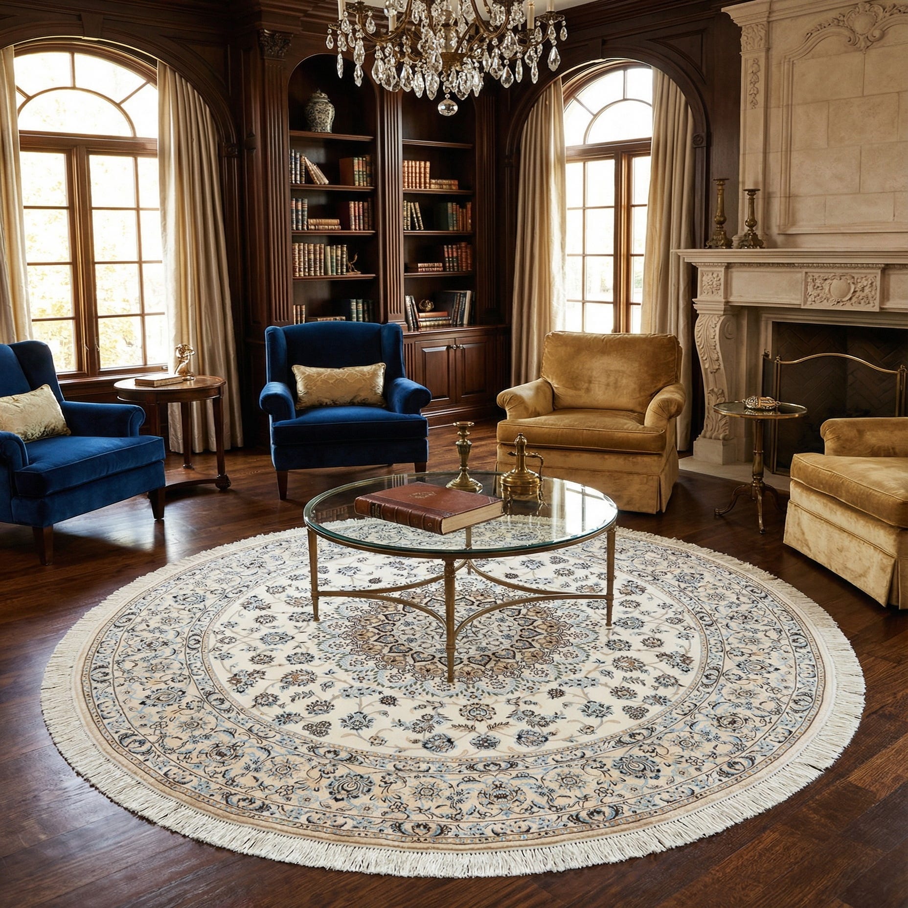 The Nain Collection offers a hand-made wool and silk rug that artfully brings together intricate patterns and an array of harmonious colors to create a piece that radiates both luxury and craftsmanship. This 7 ft round rug features a beige background upon which a densely-packed floral design unfolds in a palette of beige, cream, blue, dark blue, brown, pink, red, and green hues. The central medallion, accentuated with a deep blue and encased by layers of elaborate botanical motifs, acts as the focal point.