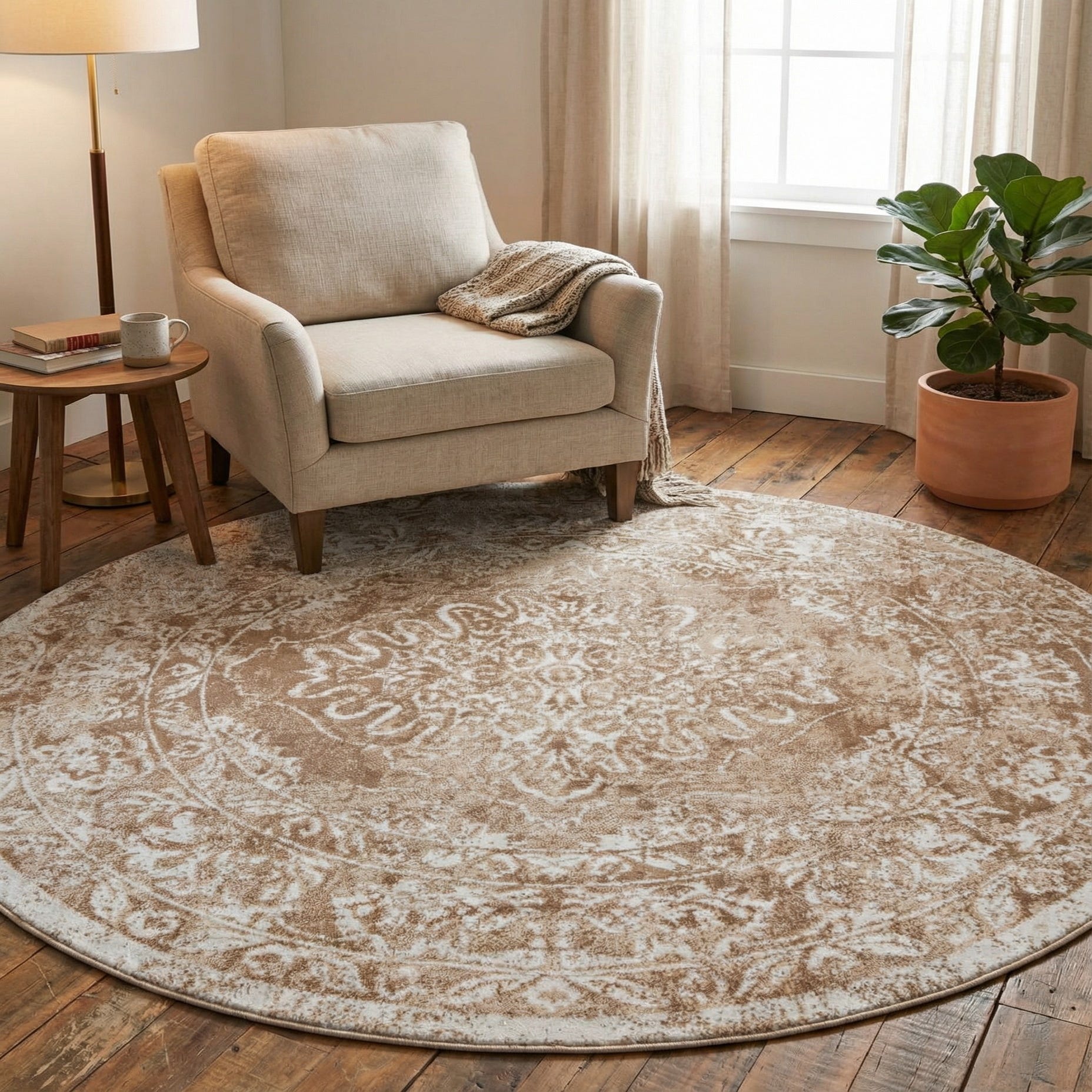 Machine-made of 100% polypropylene, this round rug offers consistent construction and a comfortable underfoot feel. Its neutral palette and transitional styling pair easily with natural wood tones, linen upholstery, and soft metallic accents, making it a good fit for a cozy living area centered around a round coffee table, a breakfast nook with a circular dining set, or a bedroom where you want a calm, grounded anchor. The muted colors also complement coastal, farmhouse, or contemporary neutral schemes when layered with textured throws and woven baskets.
