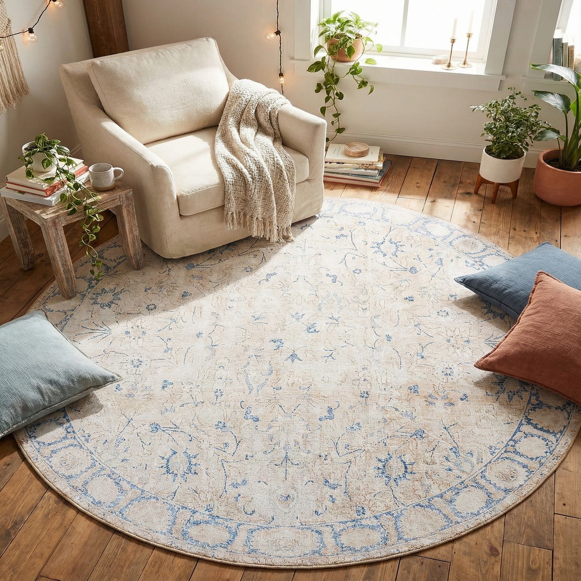 Ideal beneath a circular dining table, in a cozy seating nook, or layered at the foot of a bed, this rug pairs easily with light wood or painted furniture and linen upholstery. Use it in traditional, cottage, coastal, or transitional interiors where a quiet floral pattern and warm neutrals will complement muted pastels, plum or lavender accents, and rust or terra-cotta textiles.
