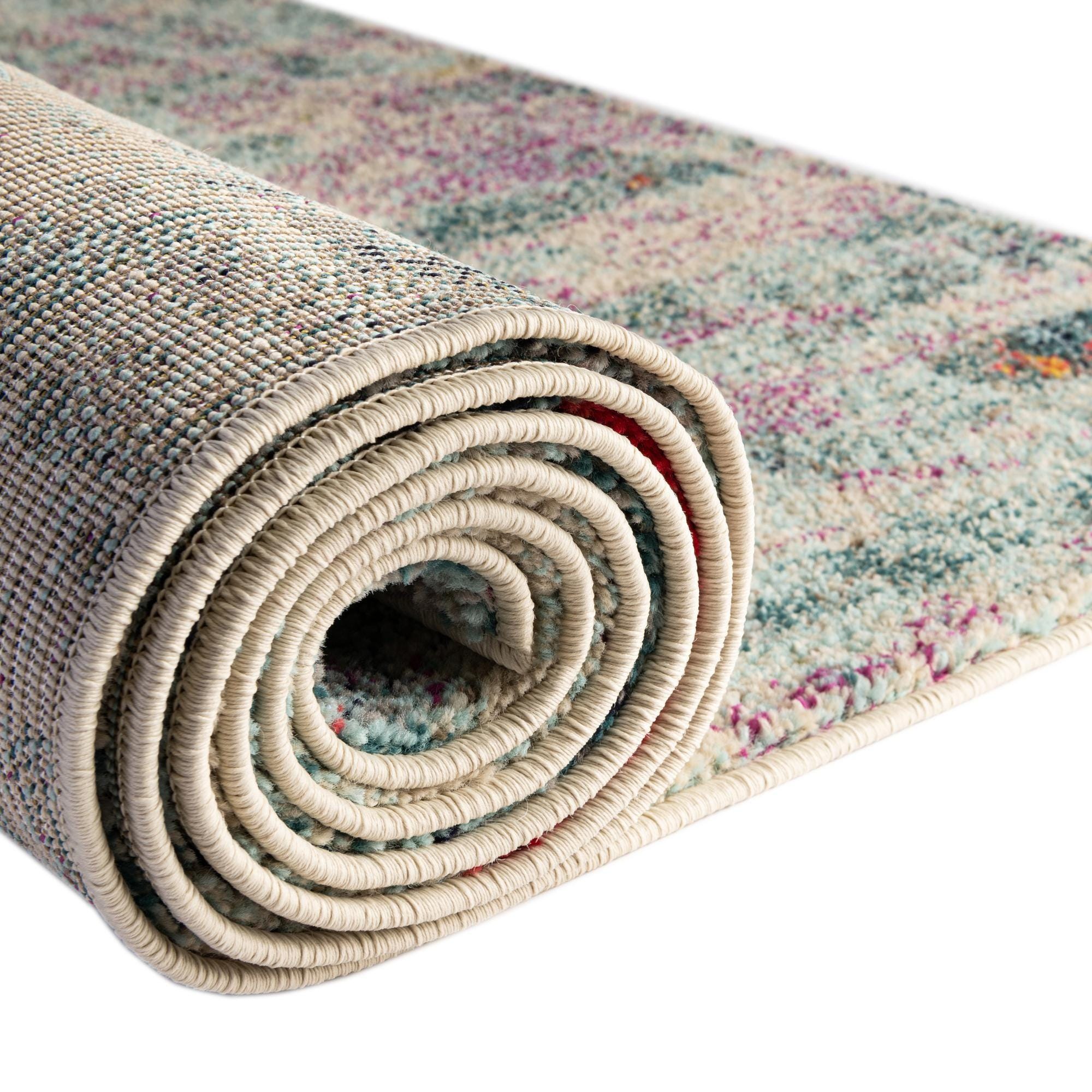 The overall look blends contemporary and transitional sensibilities—artful enough for a modern living area, yet relaxed enough for everyday spaces. Place it in a hallway or entry to give traffic zones a painterly focal point, layer it along a galley kitchen to introduce color and pattern, or run it beside a bed to warm light-wood or navy furniture. Pair with neutral walls and simple furnishings to let the rug’s colors take center stage, or combine it with other textured textiles for a collected, eclectic vibe.