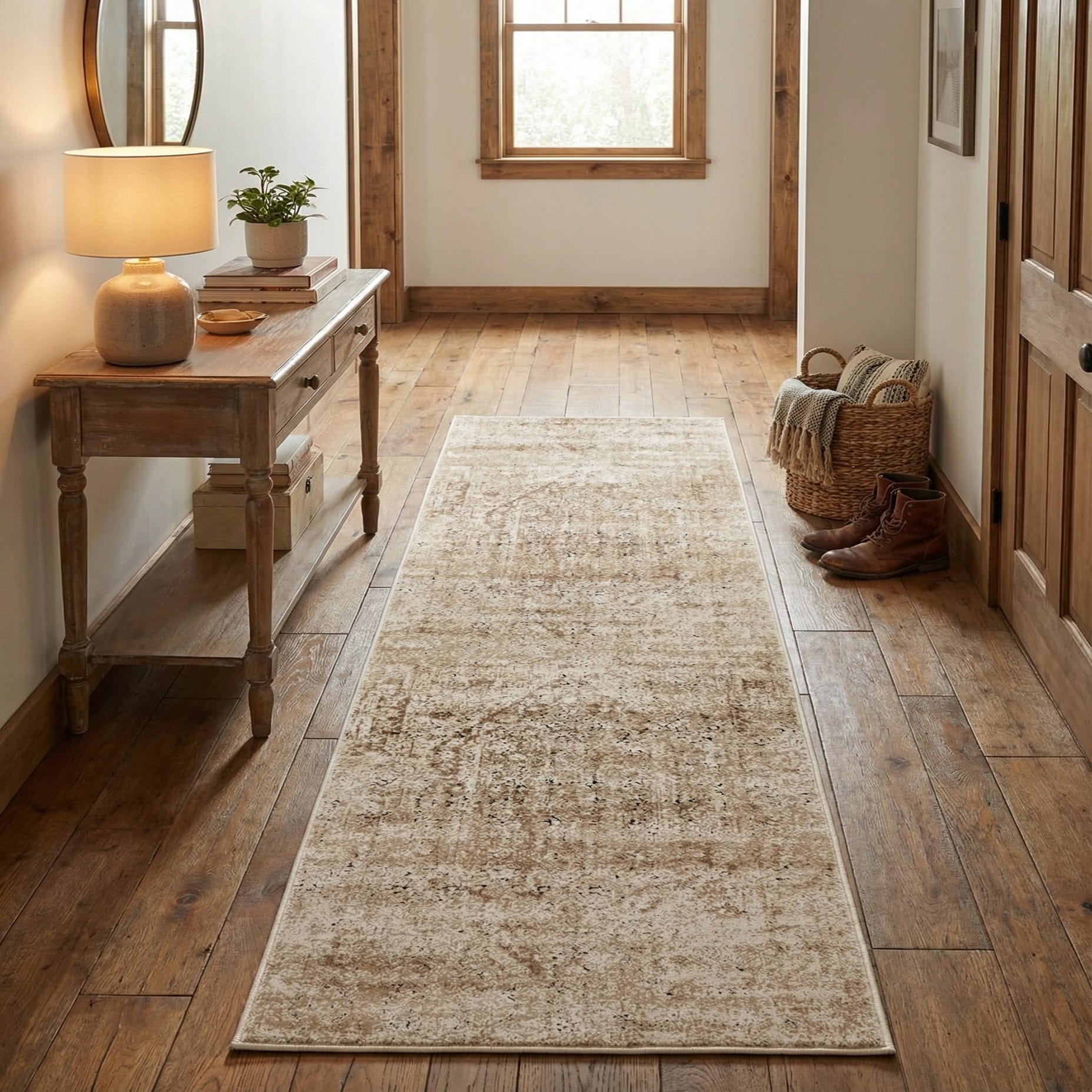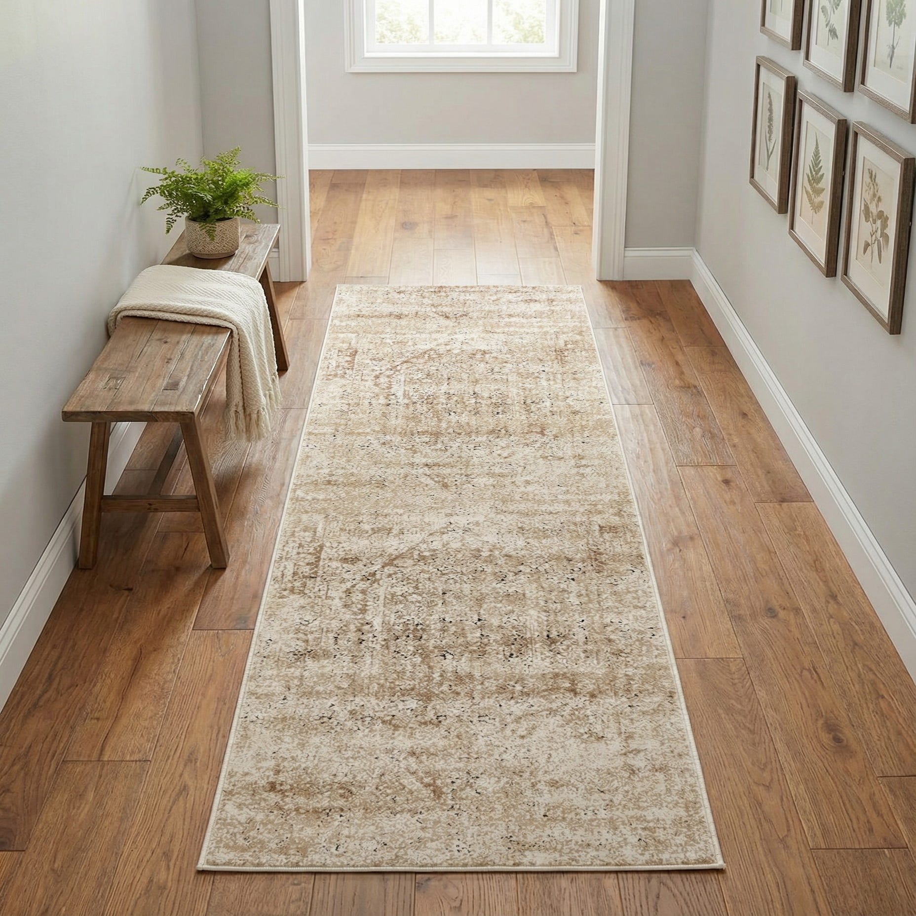 This runner works well in hallways and entryways, narrow kitchens, or layered along the side of a bed to add warmth and texture. It complements transitional, modern farmhouse, coastal, and contemporary interiors—pair it with natural wood floors and linen upholstery for a relaxed look, or use navy accents and matte black or aged brass hardware to bring out the subtle blue specks. The neutral palette keeps the room feeling light while the textured pattern conceals everyday traffic for practical, stylish floor layering.
