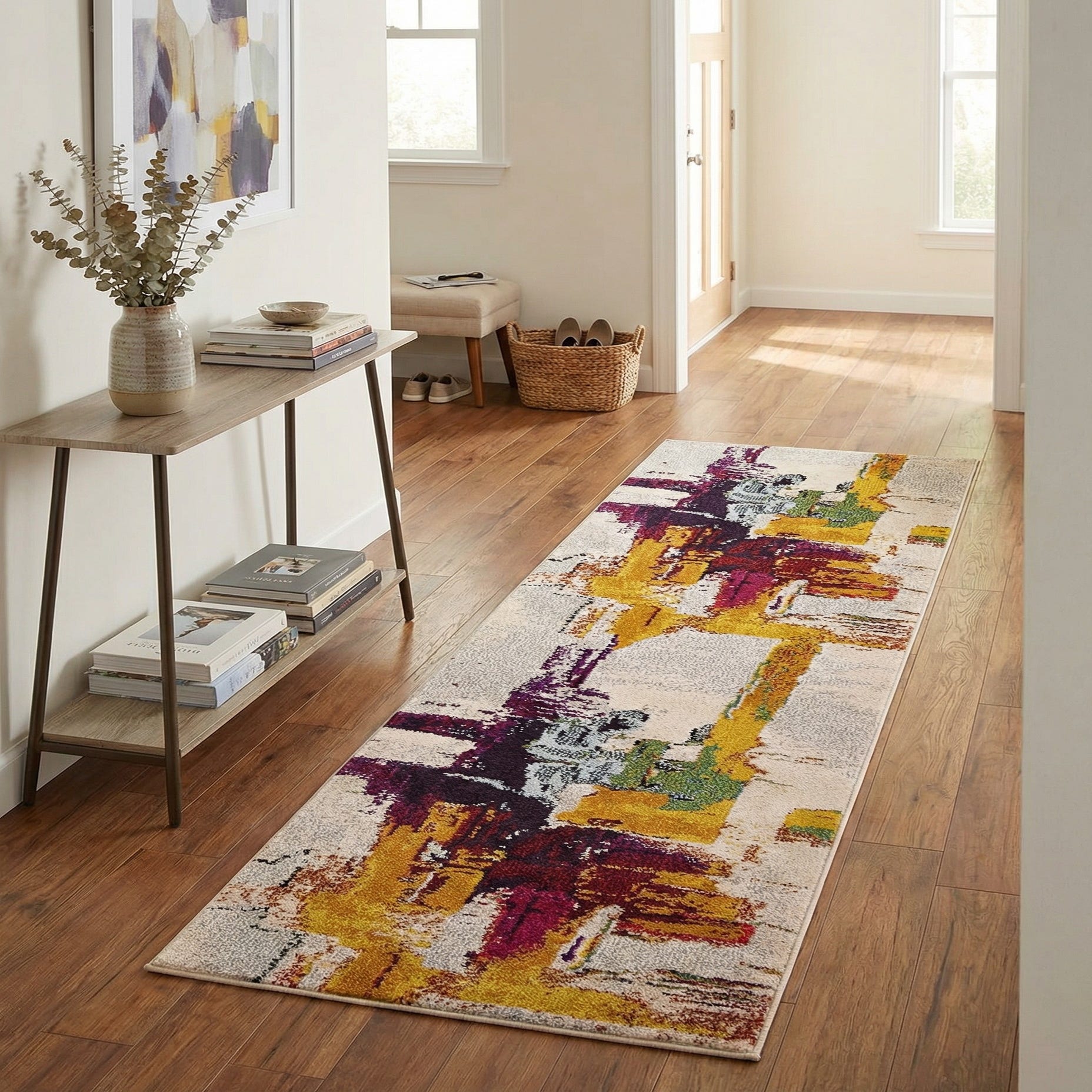 Designed as a runner, this piece anchors narrow spaces and guiding paths while adding a bold accent to neutral floors. Place it in a hallway or entry to introduce color without overwhelming the room, layer it in a modern living area to tie together colorful accents, or use it in a contemporary kitchen for a graphic, textile touch. It pairs well with mid-century silhouettes, industrial metal finishes, or a minimalist palette that benefits from a focused pop of color.