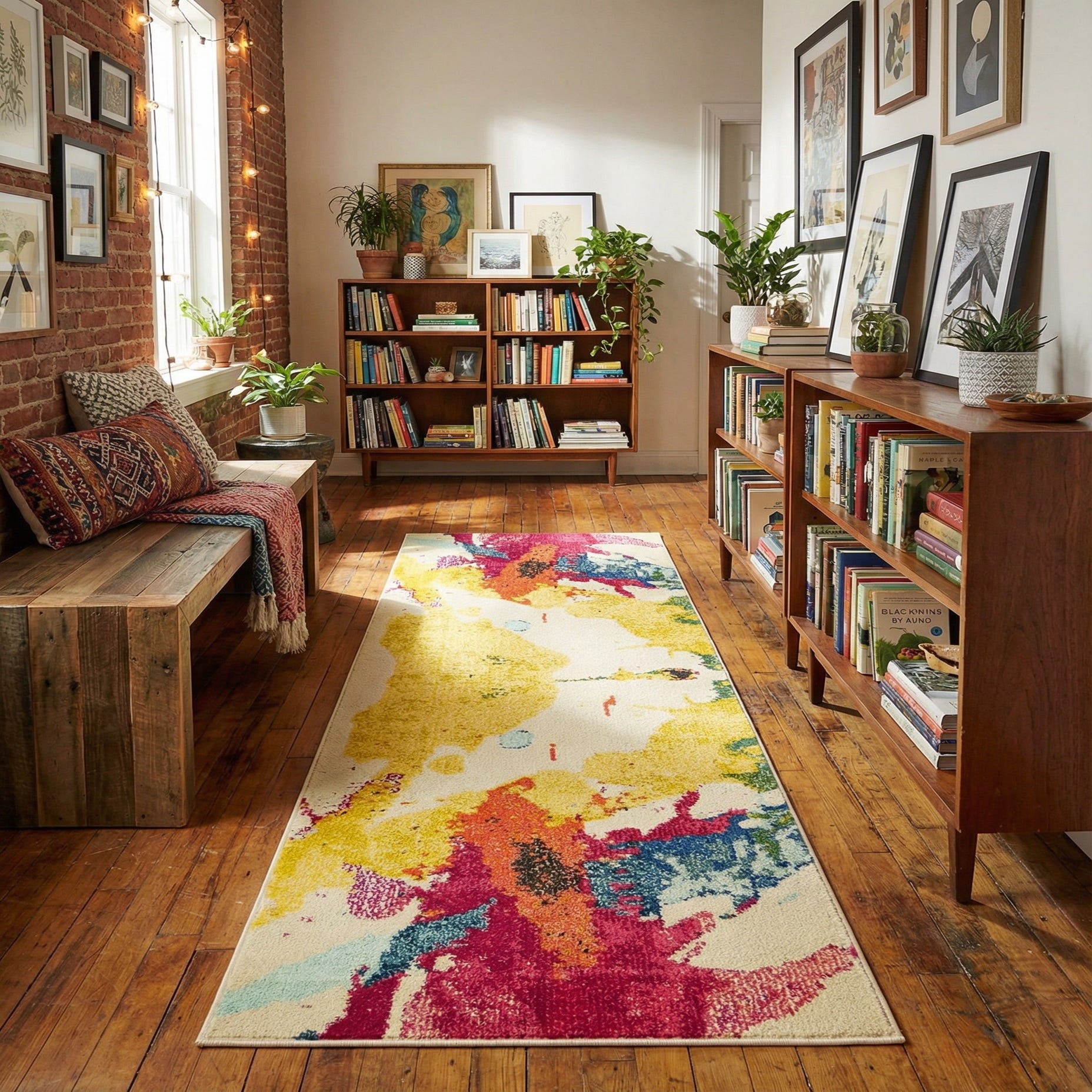 The texture of the rug offers a soft feel underfoot while promising shed-free and stain-resistant properties, making it an excellent choice for high-traffic areas. This artistic runner would seamlessly integrate into various interior scenarios, such as in a contemporary hallway, alongside eclectic living room furnishings, or as an accent piece in a minimalist space that could use a burst of color and pattern.
