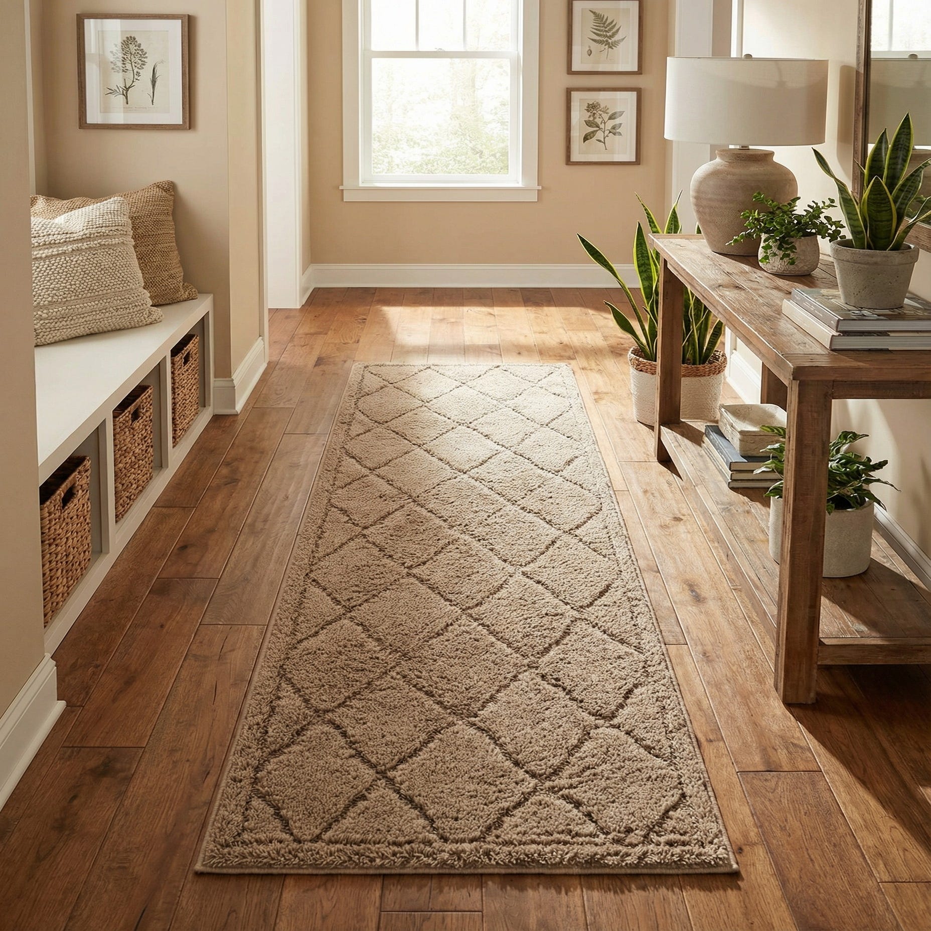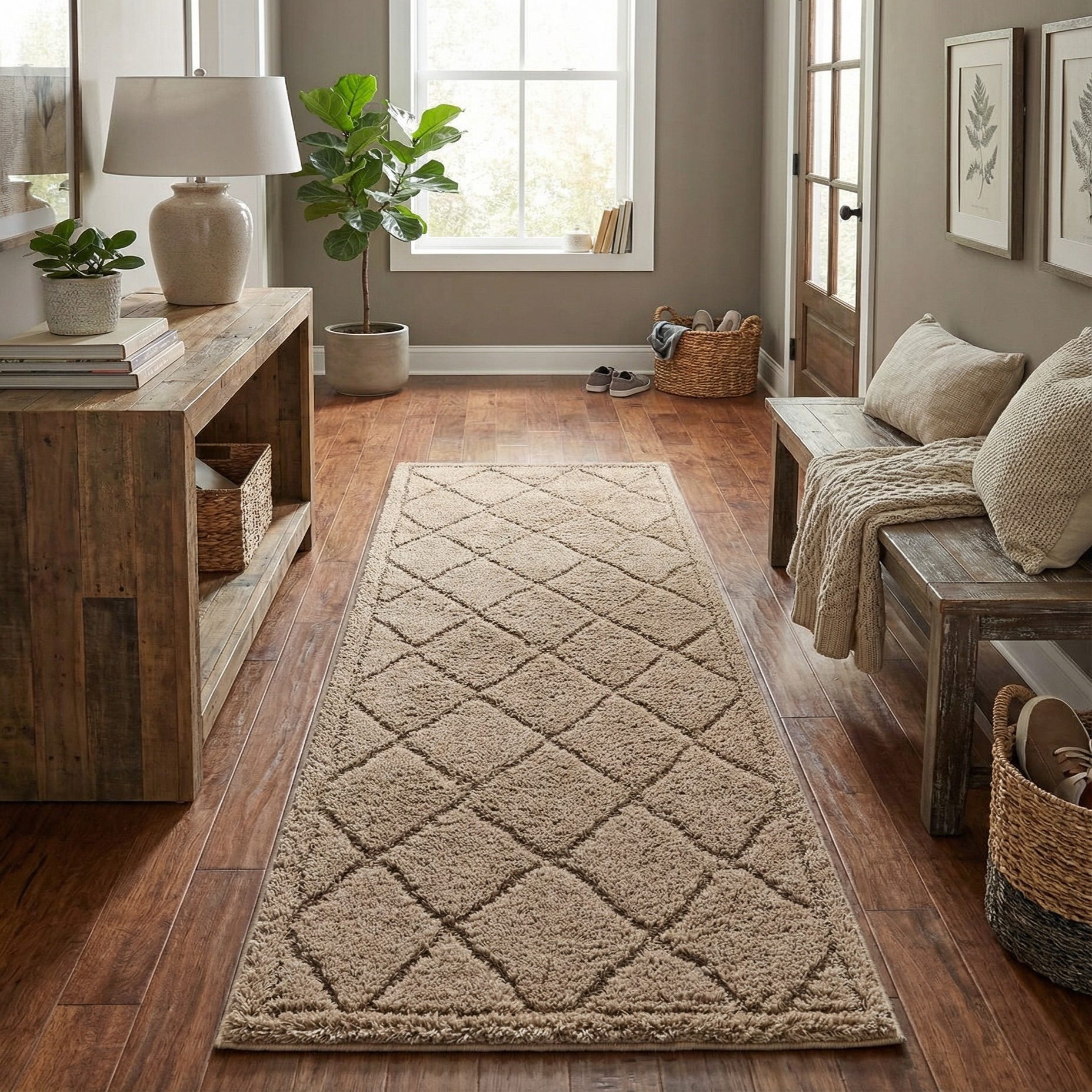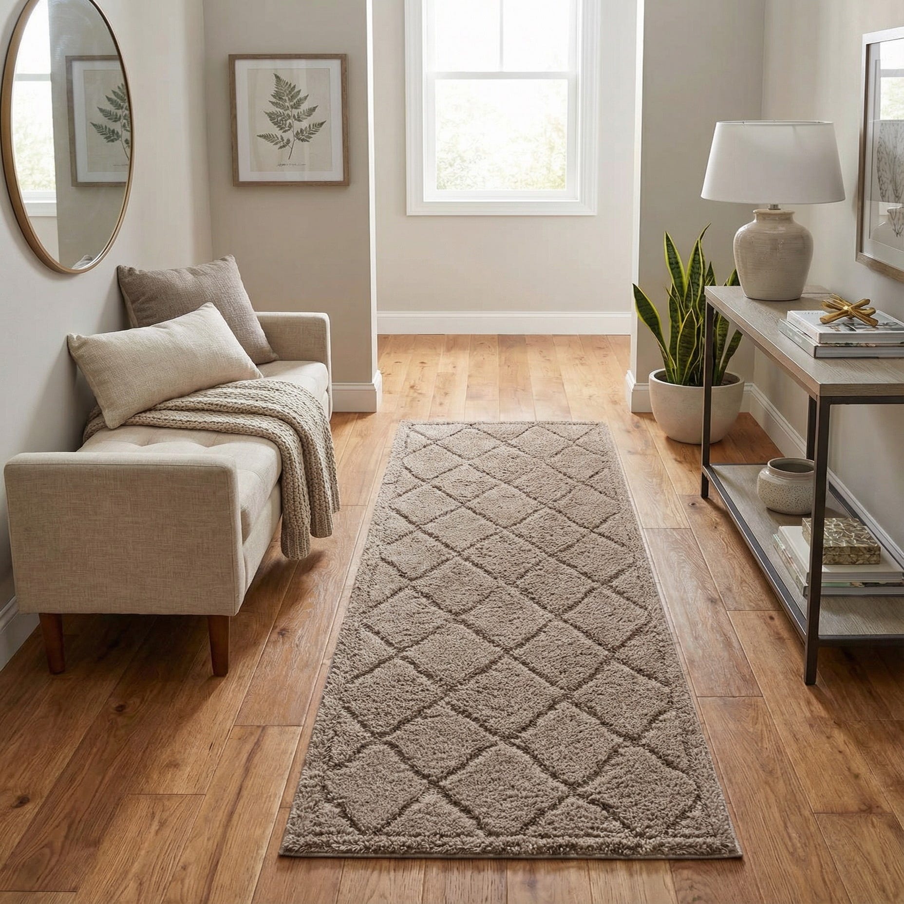 A soft, shag pile in warm beige shapes a subtle diamond lattice across the surface, with the raised motif creating gentle depth and movement underfoot. The background and pattern are closely matched in tone, giving the runner a calm, monochromatic look that still reads textured thanks to the high-and-low pile. A narrow bordered edge frames the design cleanly, and the fibers have a slight sheen that catches light without drawing attention away from a room’s other elements.