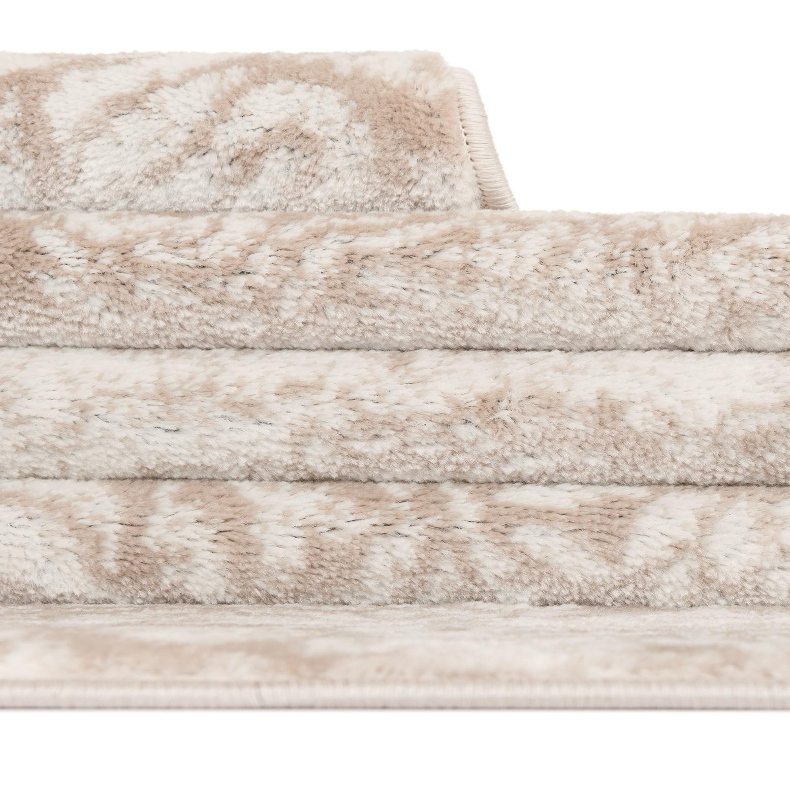 A soft, low-profile runner woven in 100% polypropylene presents a faded medallion and scrolling floral pattern across a warm beige background with ivory highlights. The design blends traditional motifs with a gently distressed finish, giving the surface a layered, lived-in appearance. The machine-made construction produces a consistent, tactile pile that feels smooth underfoot while maintaining the clear contrast between the beige ground and ivory ornamentation.
