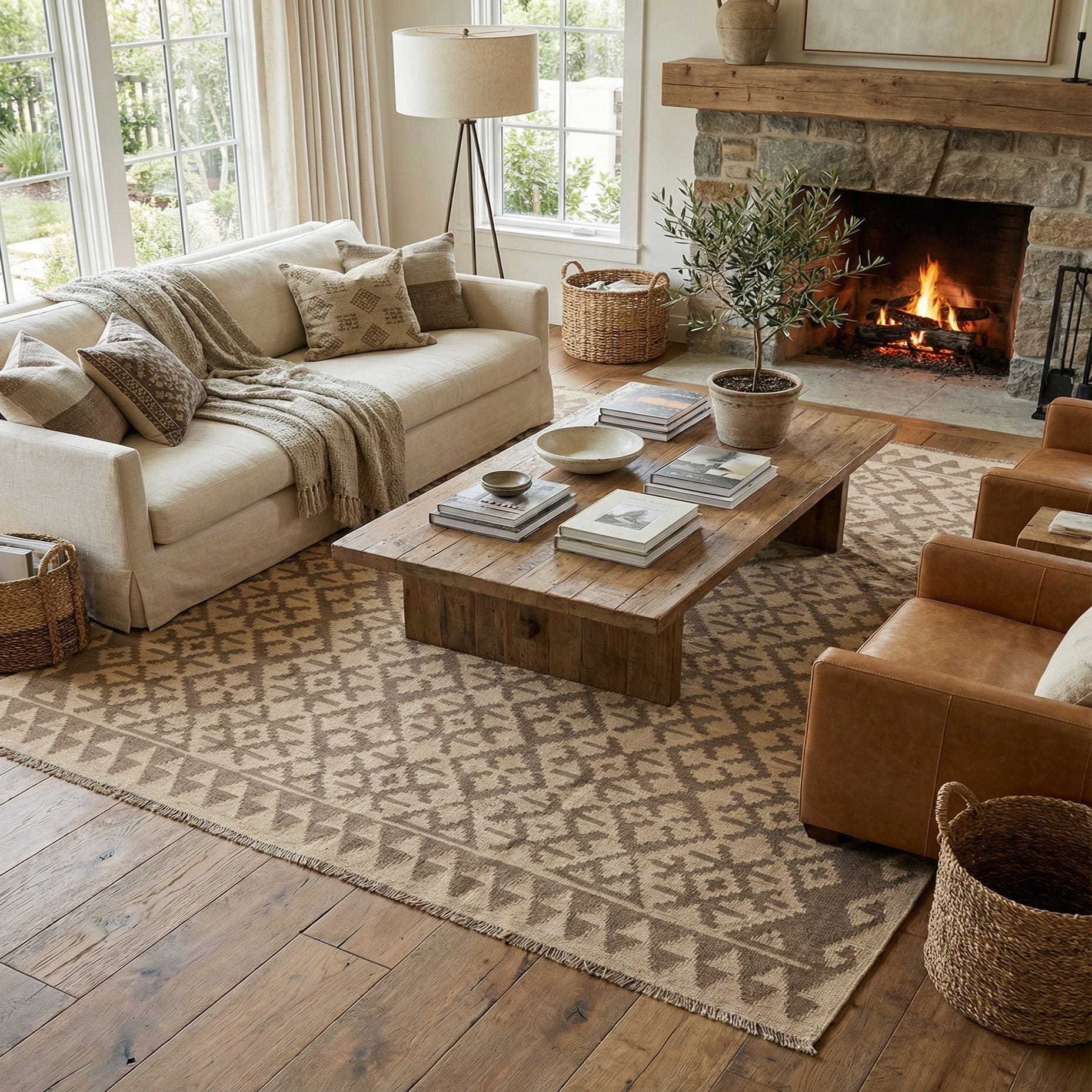 Primary color is Beige. Colors in this rug include: Beige, Brown.