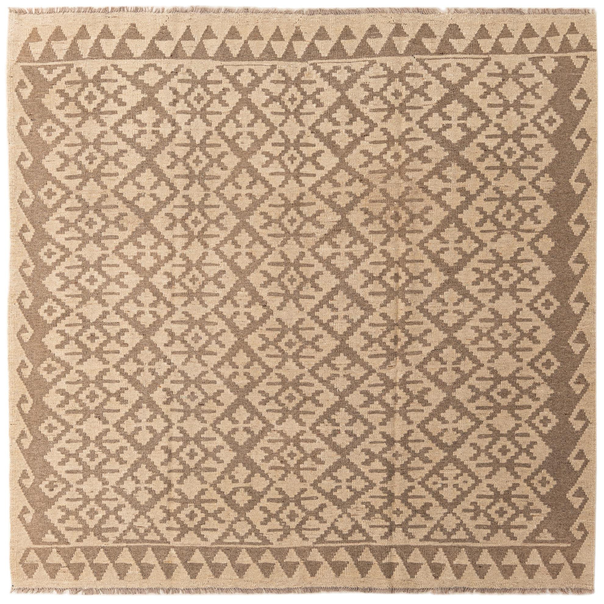 A square Kilim Maymana wool rug featuring a tribal geometric pattern in shades of brown and tan.