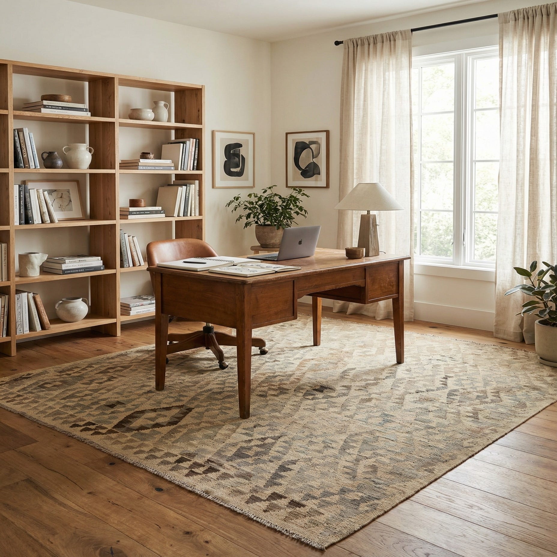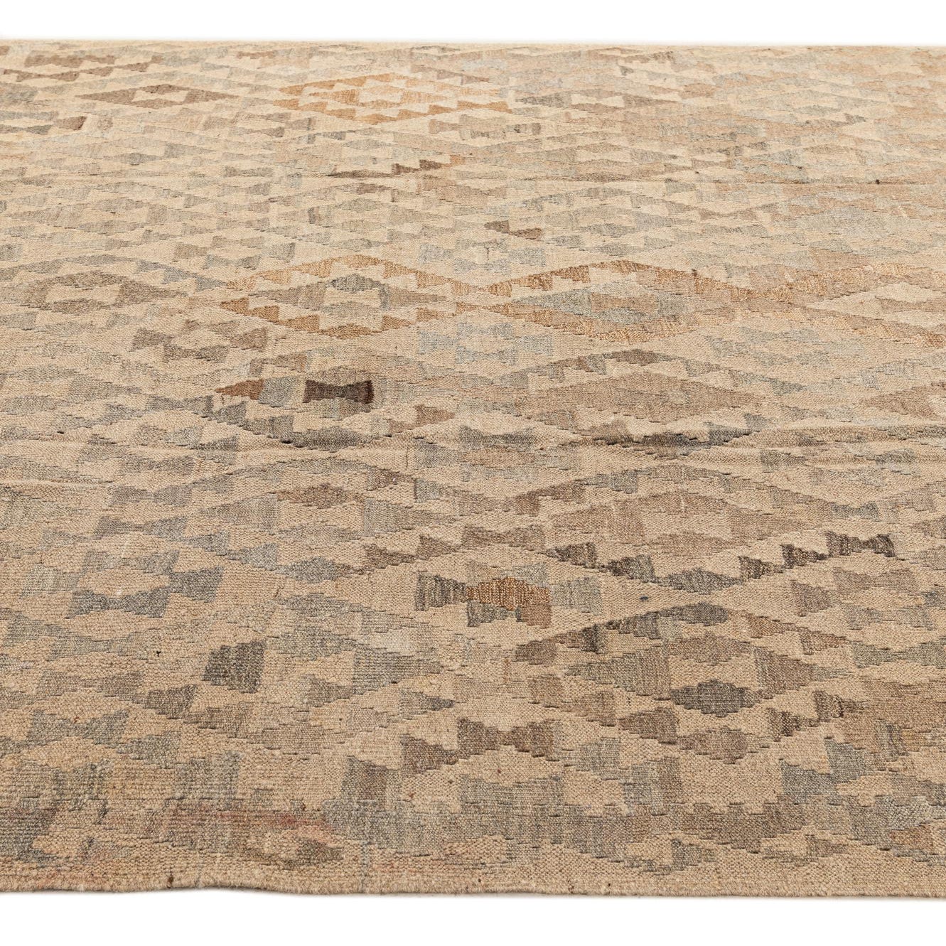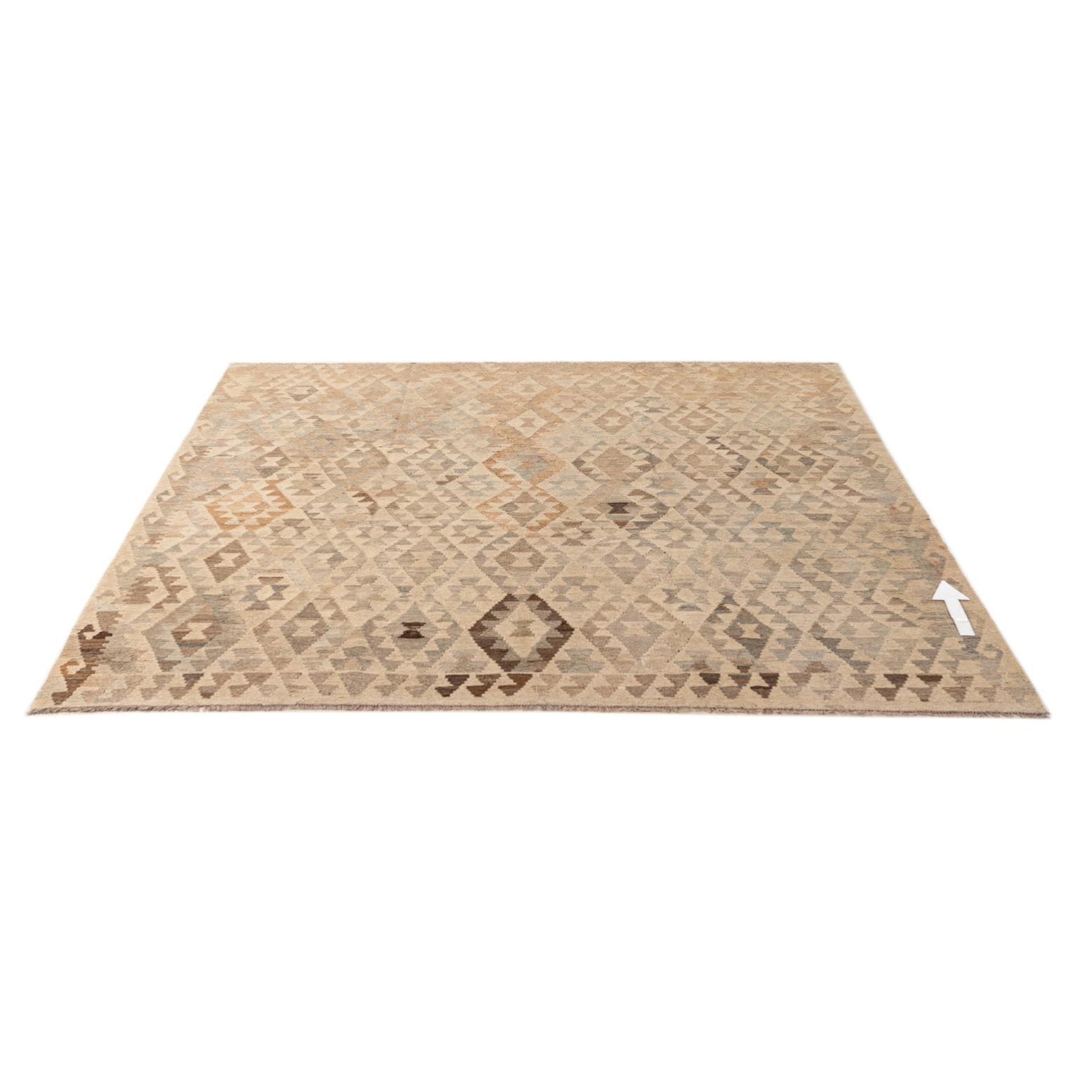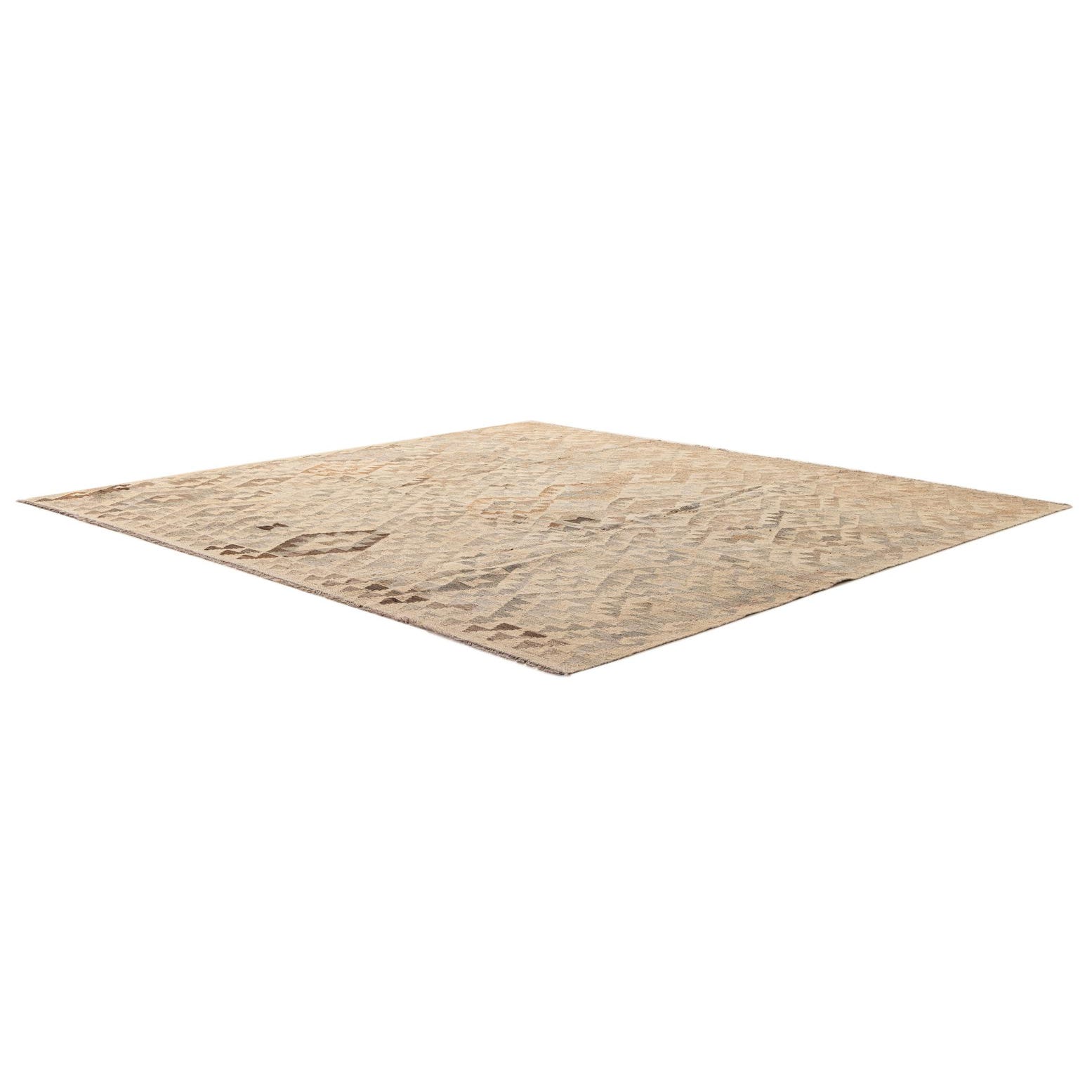 A 6' 10 x 7' 0 square Kilim Maymana rug featuring a tribal diamond pattern in various shades of brown, tan, and cream.