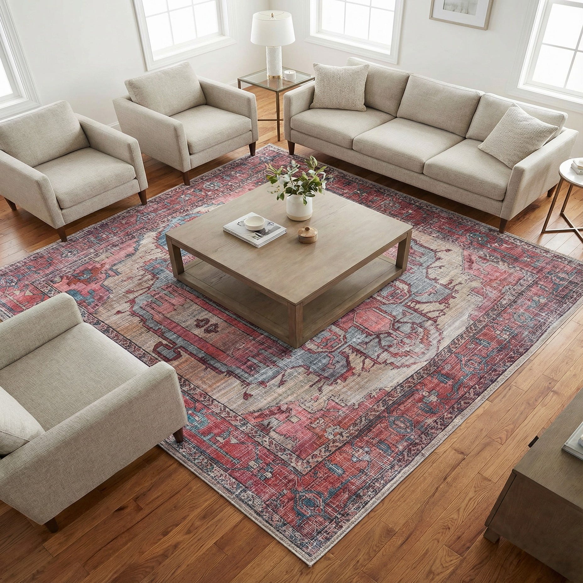 Made on a machine with polyester chenille, the pile has a soft, slightly velvety hand and a low, even profile that’s comfortable underfoot without feeling bulky. The warm beige base and red tones pair naturally with warm woods and leather, while the blues bring a cool counterpoint that works well with navy upholstery or pale linens. Use it to anchor a living room seating group, add layered warmth beneath a bed, or sit centered under a reading nook to unify mixed textures and colors.