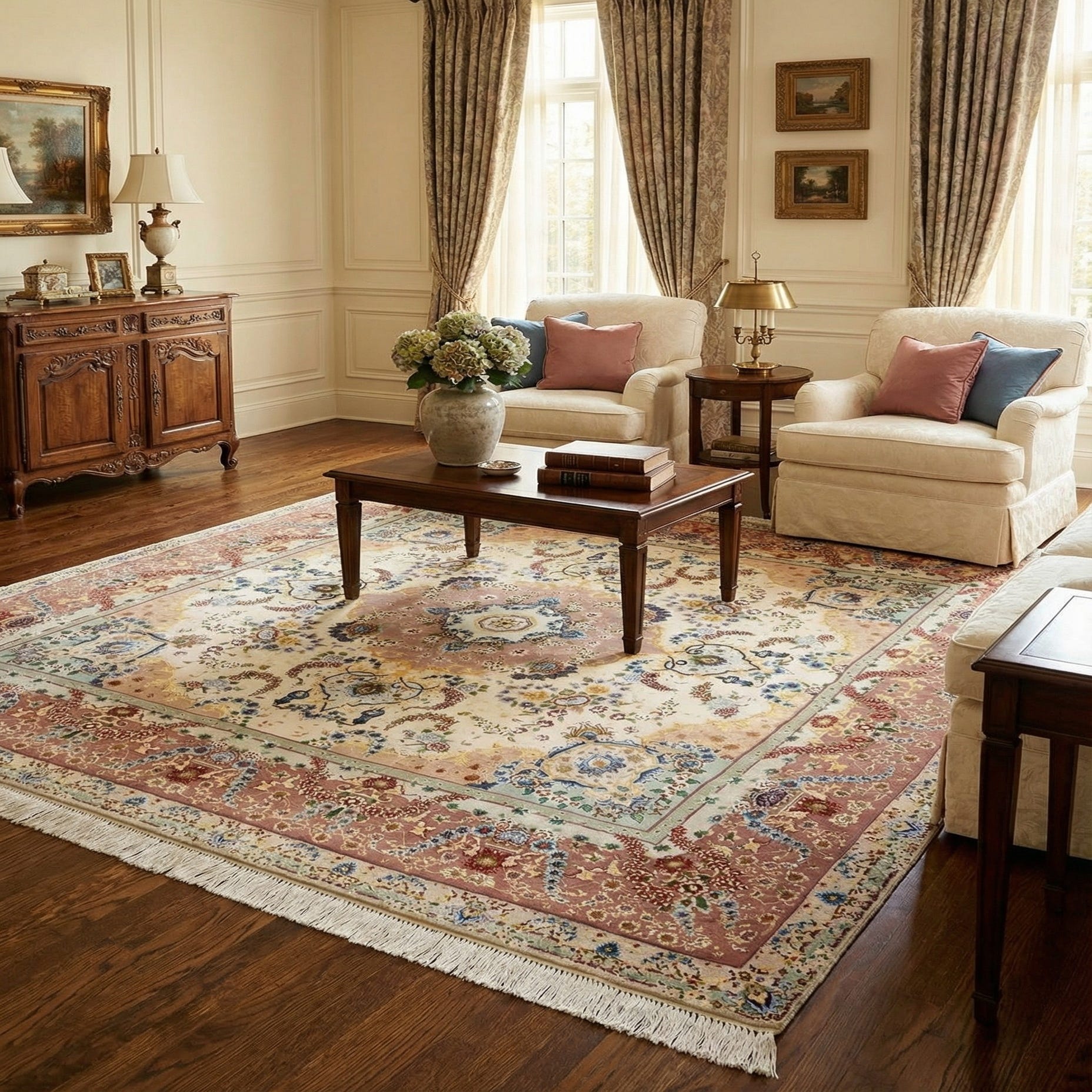 A square 6'4" x 6'8" Persian Tabriz rug with a central medallion, featuring intricate floral patterns in ivory, cream, and brown tones, with a detailed border.