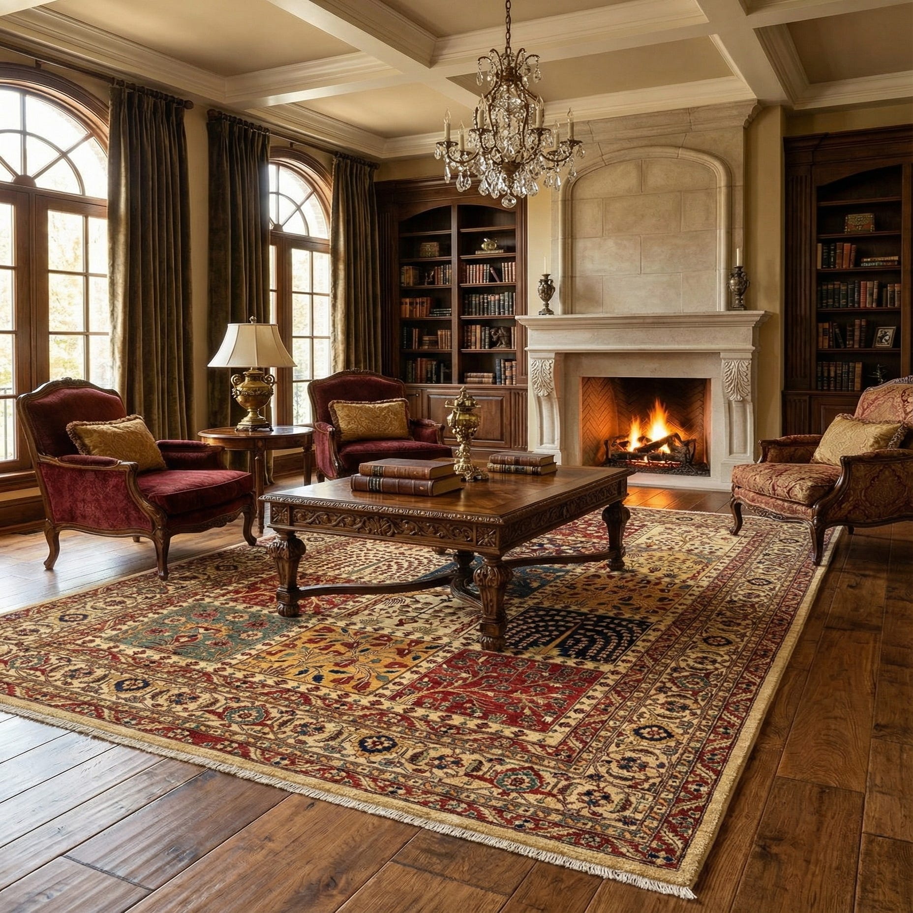 This rug sits well in classic and transitional interiors: position it beneath a seating group to anchor a living room with leather or upholstered sofas, place it under a dining table to introduce layered pattern, or use it in a study or entry to add visual warmth. It pairs naturally with warm wood floors, aged brass or dark metal accents, and textiles in navy, olive, or muted red, and it can also bring traditional character to a pared-back contemporary scheme when layered with simple, neutral furnishings.