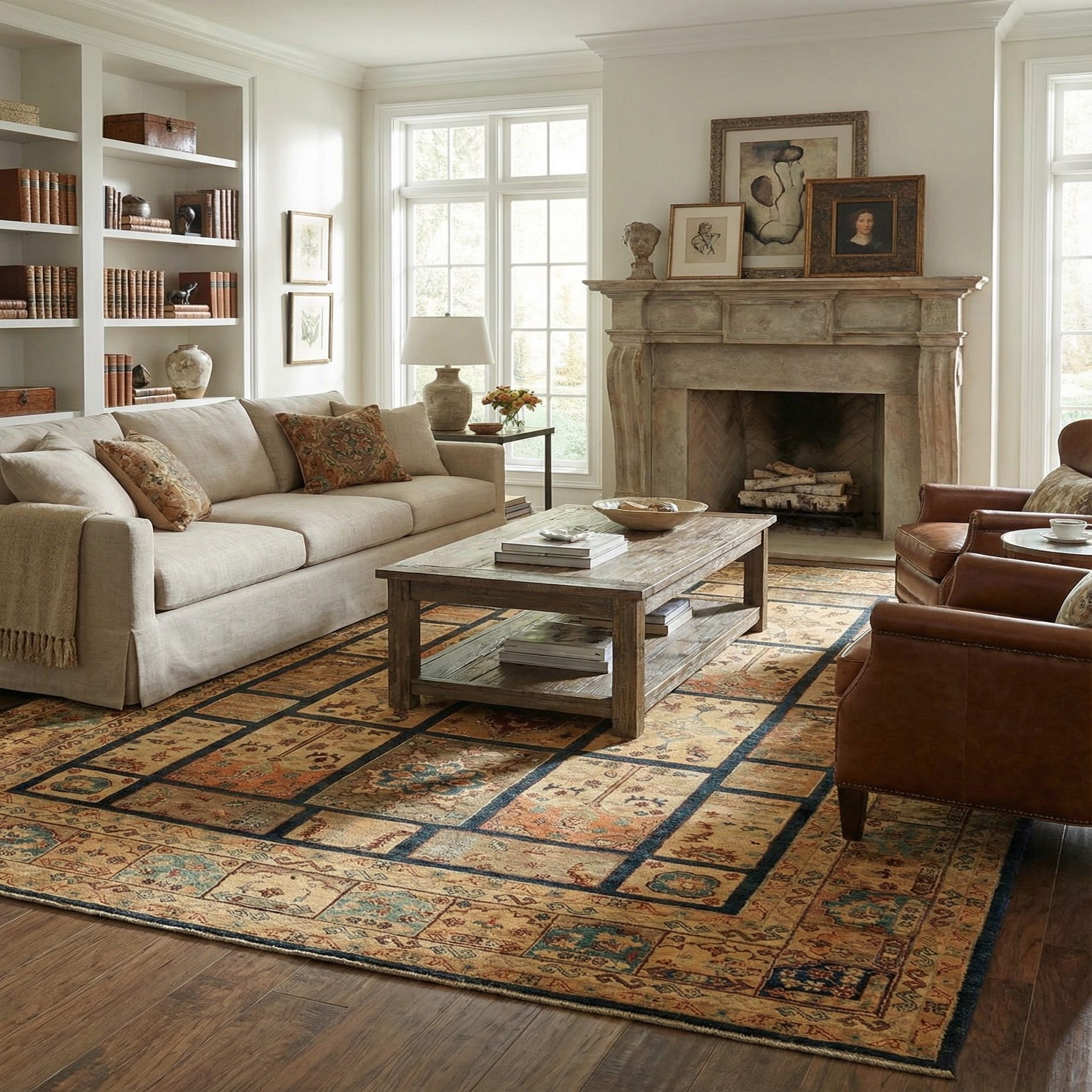 A 7x10 rectangular Ariana Ziegler rug featuring a traditional botanical and tribal pattern in browns, tans, creams, and deep blue, ideal for a living room.