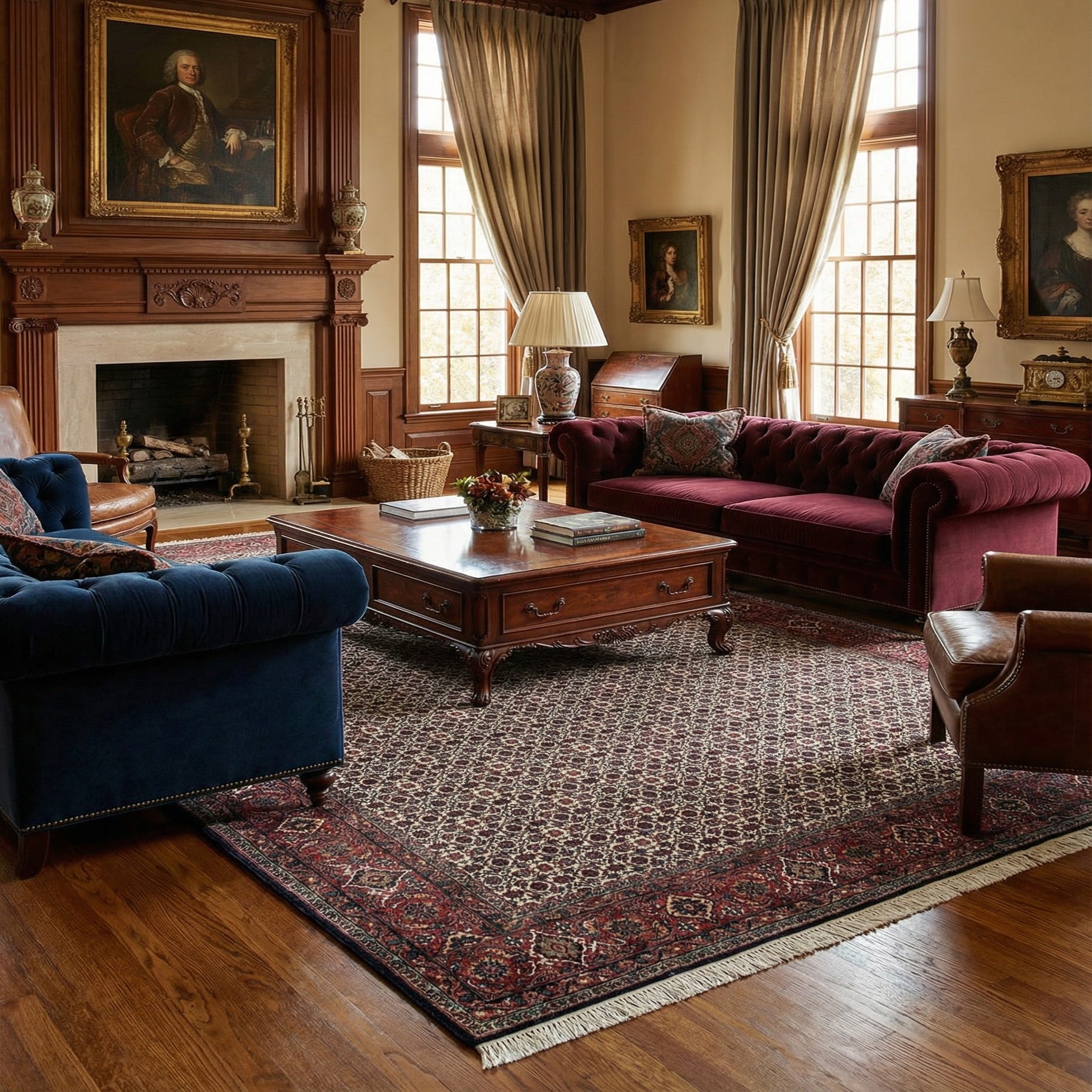 This Bidjar rug would make a compelling addition to interior spaces that draw inspiration from traditional, classic, or vintage aesthetics. It could serve as the focal point in a formal living room or dining area, complementing dark wood furniture and adding warmth to the space. The rug's intricate pattern and color palette also make it a versatile choice for an office or library, where it can enhance the room's character without overwhelming it. Its hand-made wool craftsmanship ensures that this piece will endure as a statement of timeless style and craftsmanship.