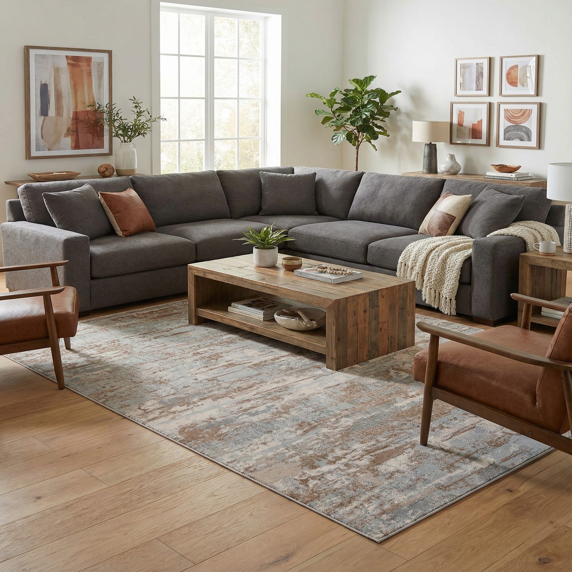 A 7x10 rectangular Caspian rug featuring an abstract modern pattern in shades of brown, tan, and cream.