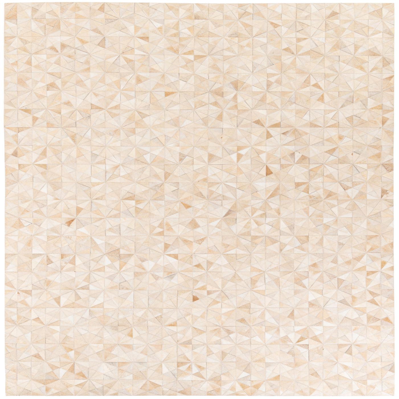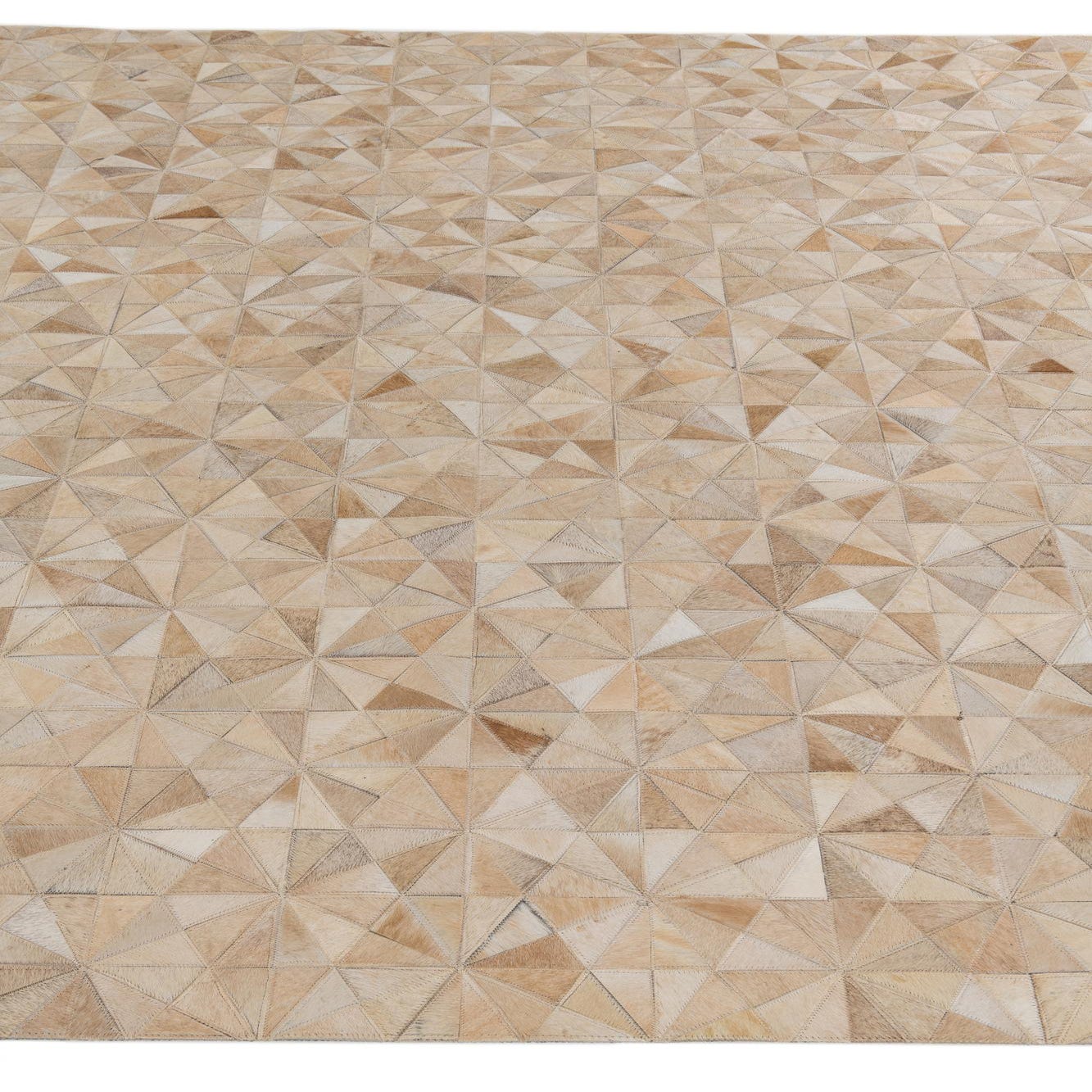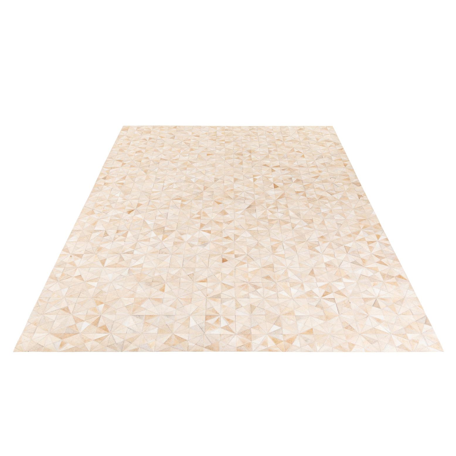 A 7x10 rectangular Cowhide Stocks rug from Rugs.com, featuring a modern geometric pattern in various shades of brown, tan, and cream, suitable for a living room.